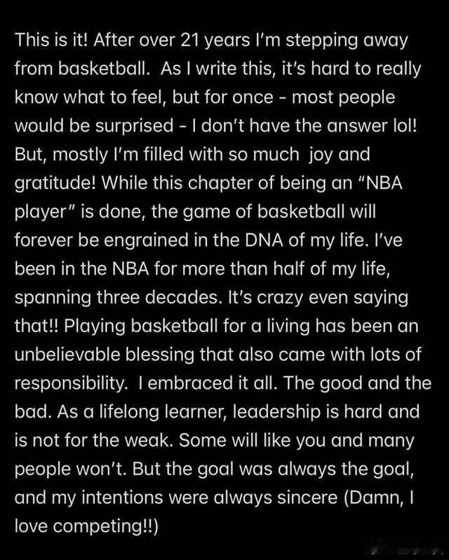 但更多的是喜悦与感恩!作为‘NBA球员’的这个篇章已经结束,但篮球这项运动将永远融入我生命的DNA。我在NBA的时间超过了我人生的一半,跨越了三个年代。光是说出来都觉得疯狂!!能够以打篮球为生,是一种难以置信的恩赐,同时也伴随着巨大的责任。我拥抱了这一切。”
