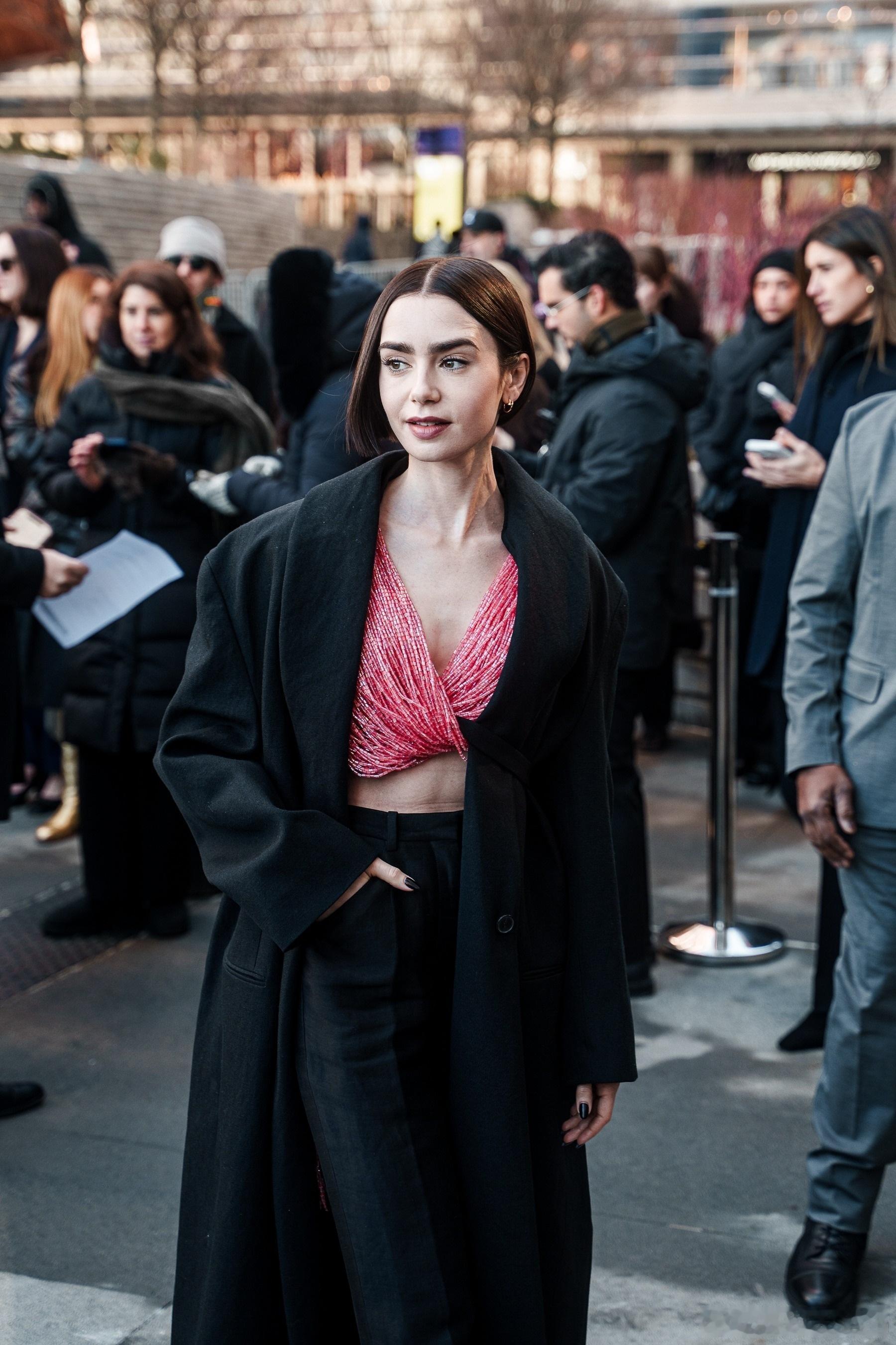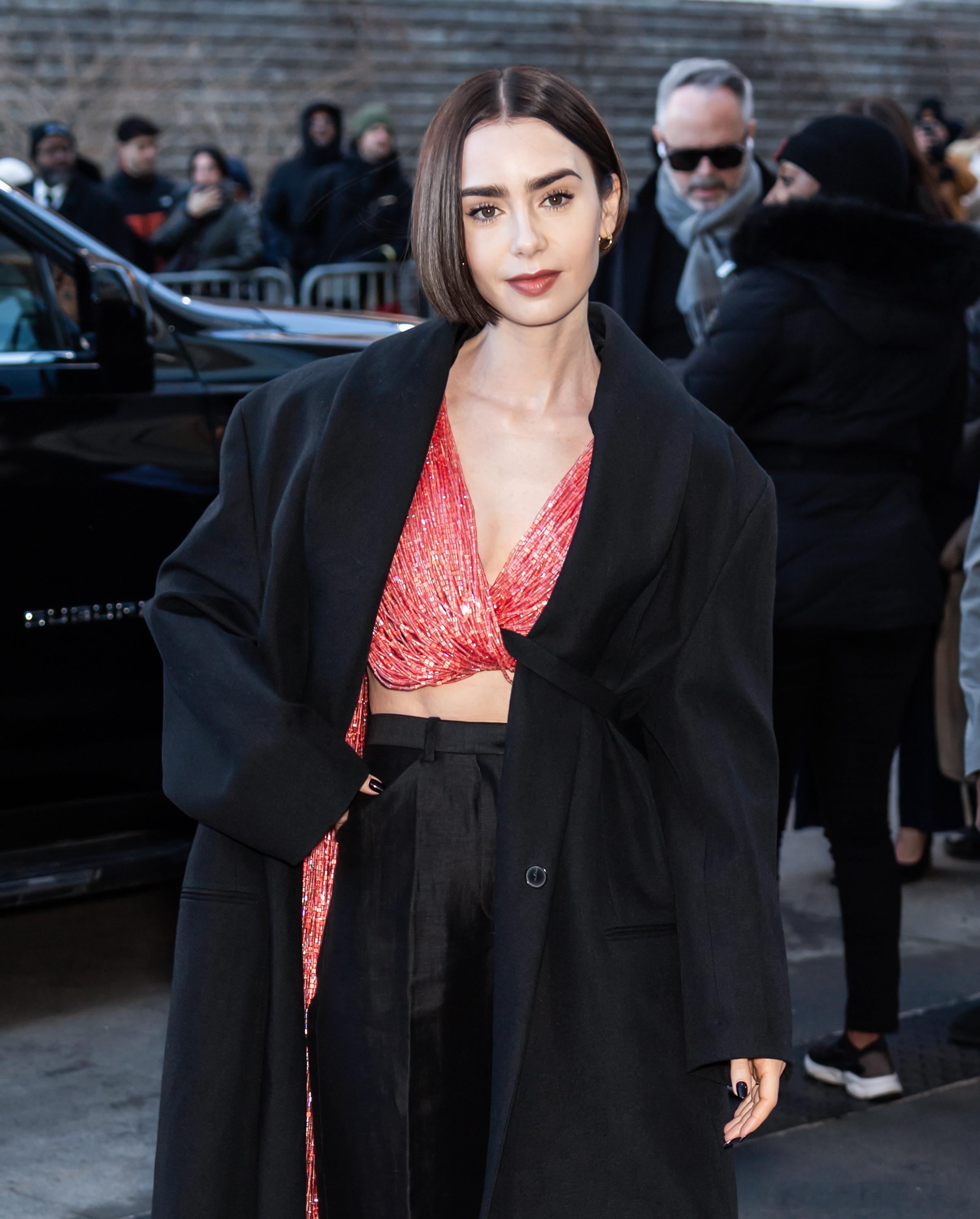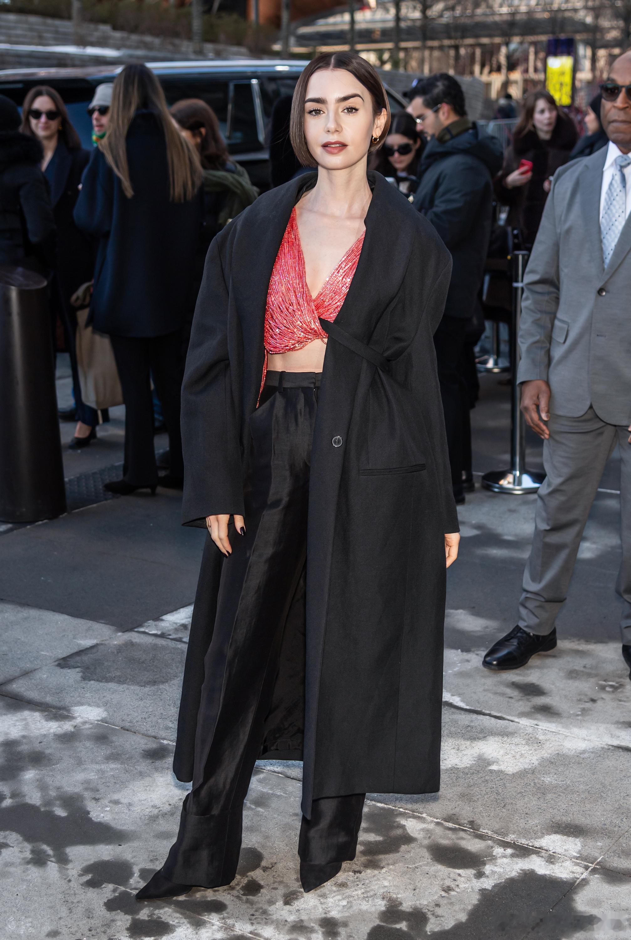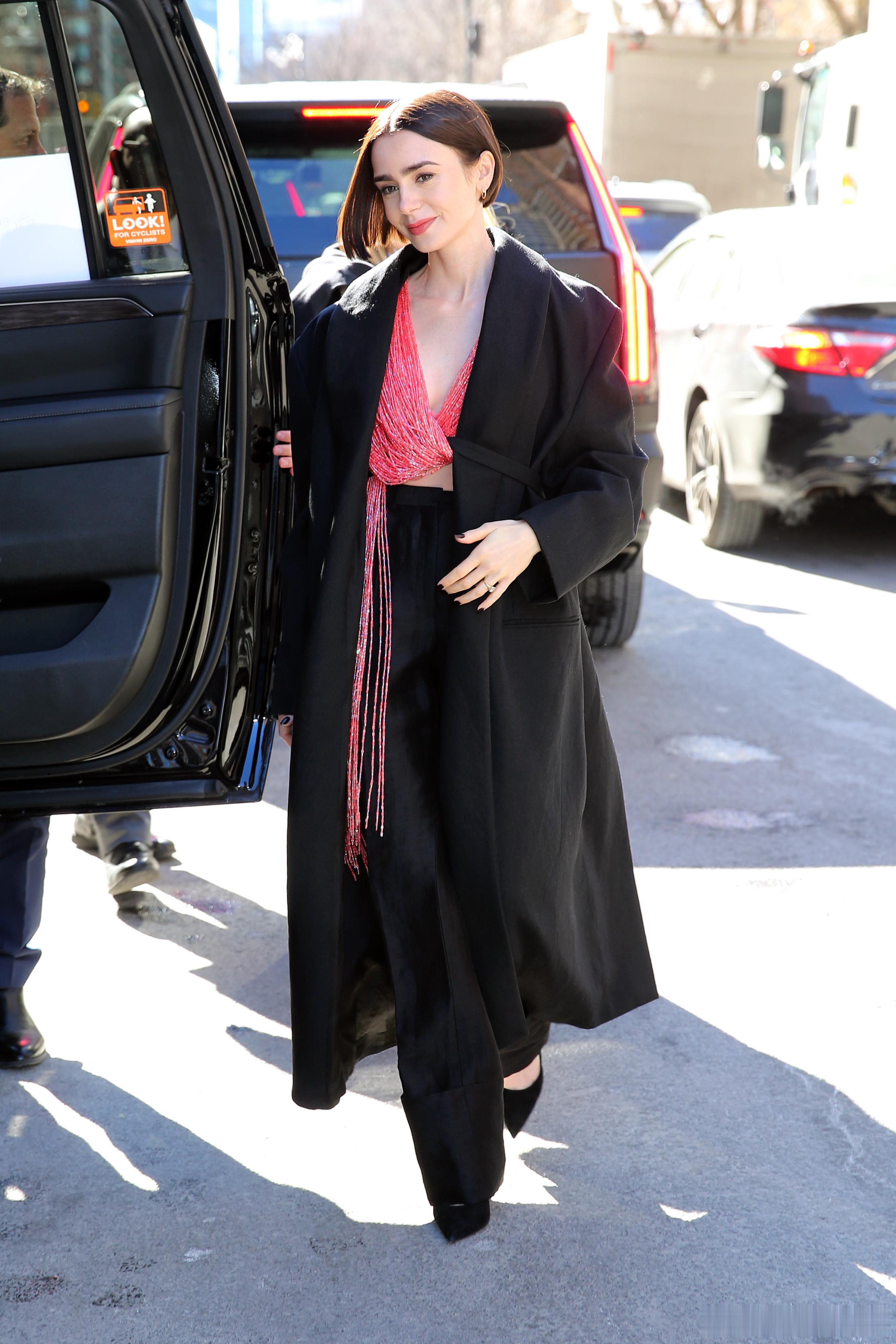 Lily collins莉莉柯林斯在纽约外出,莉莉身着串珠上衣离开酒店前往参加Calvin Klein品牌的纽约时装周大秀