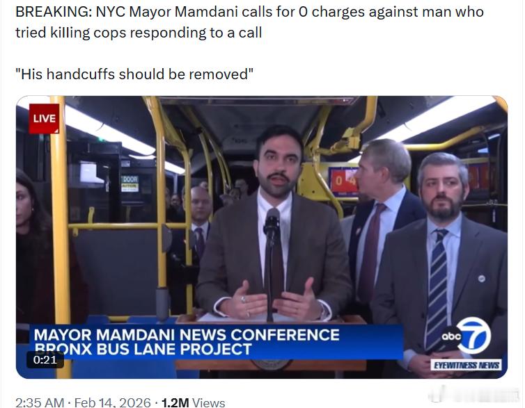 纽约市市长曼达尼呼吁对一名试图杀害前来处理报警事件的警察的男子不予起诉,并表示“他的手铐应该被解开”。