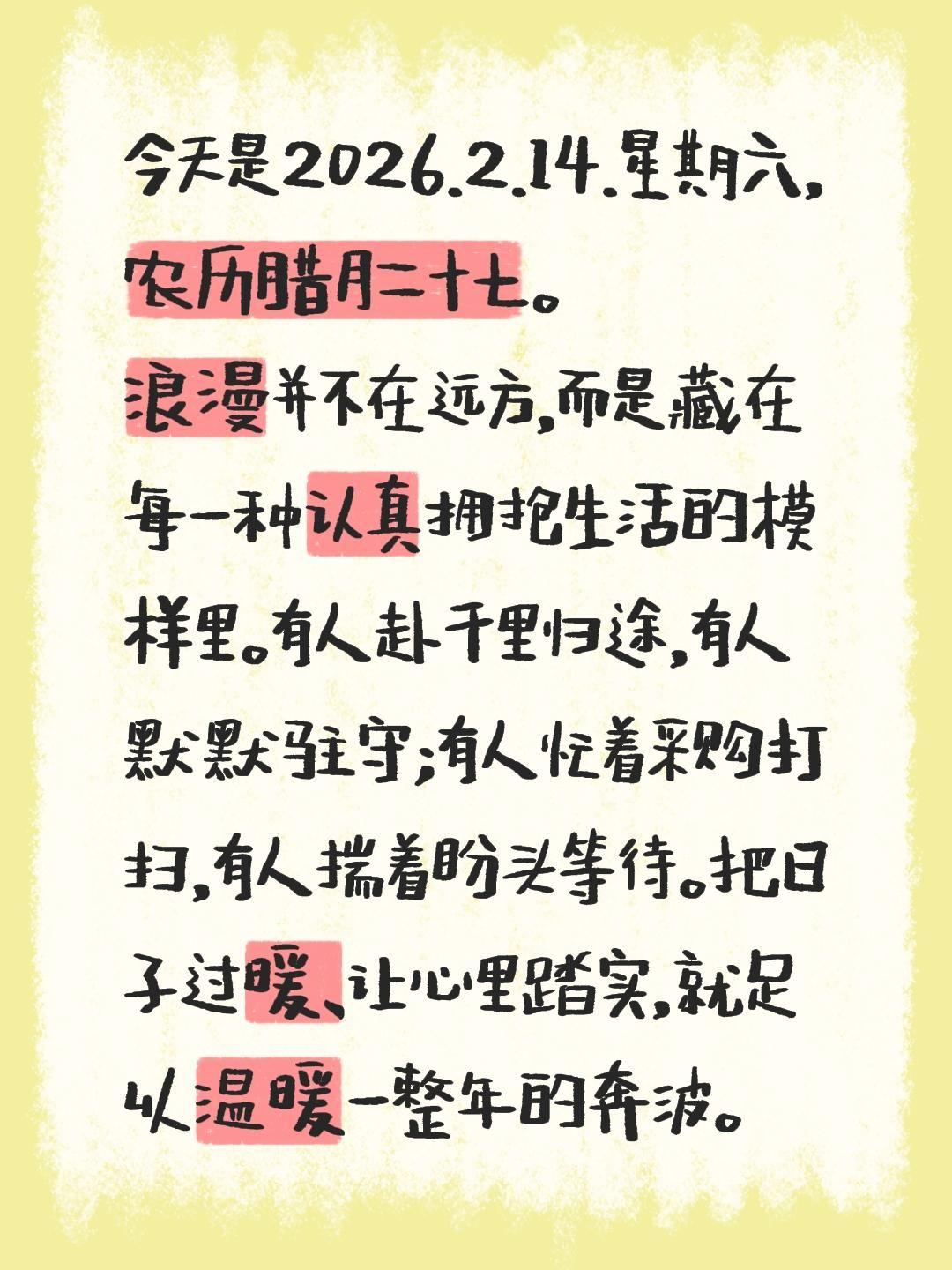今天是2026.2.14.星期六,农历腊月二十七。 浪漫并不在远方,而是藏在每一种认真拥抱生活的模样里。有人赴千里归途,有人默默驻守;有人忙着采购打扫,有人揣着盼头等待。把日子过暖、让心里踏实,就足以温暖一整年的奔波。
