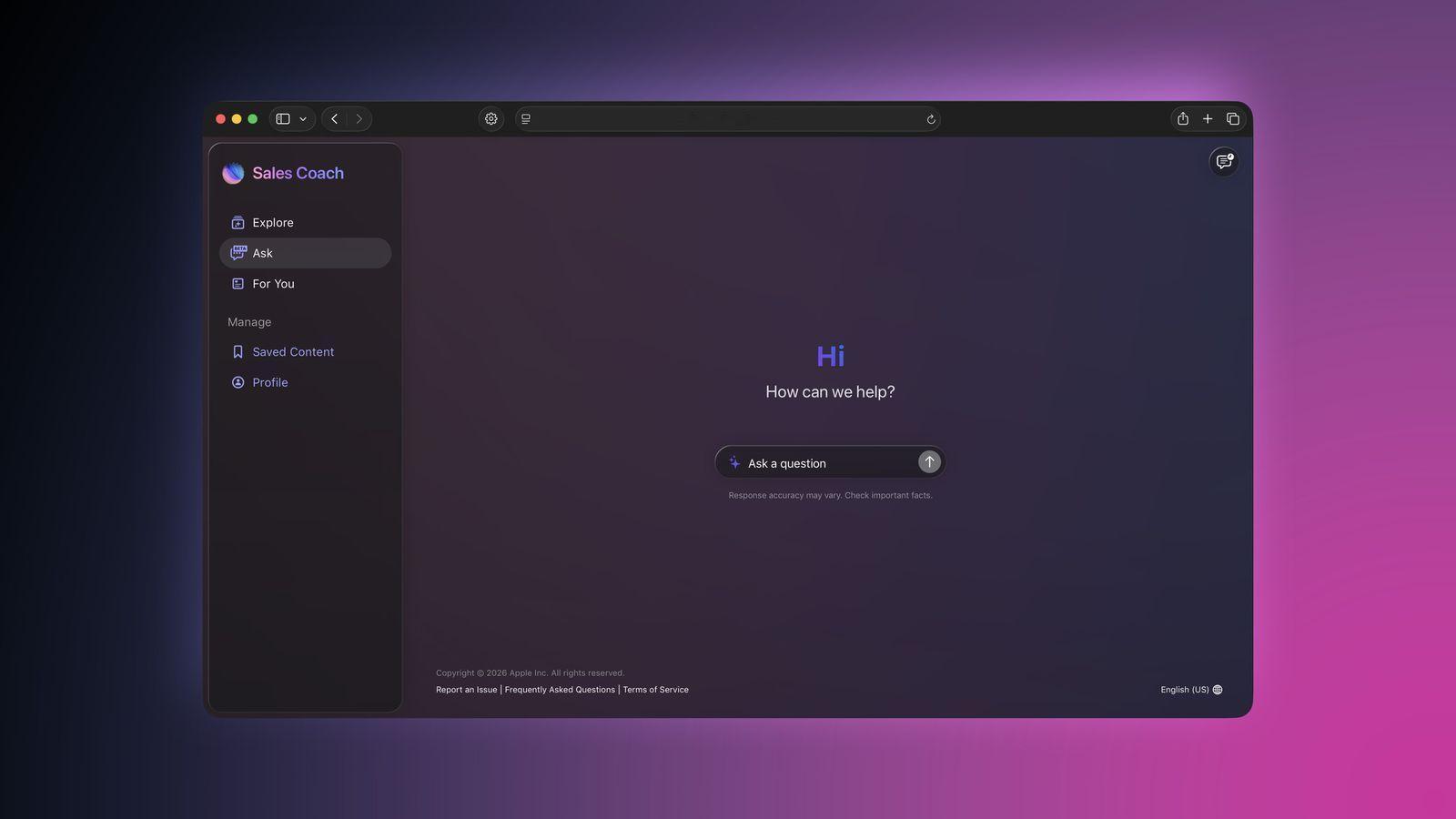 “Sales Coach”工具已在 salescoach.apple.com 网站推出。它是 Apple 销售合作伙伴的内部工具,因此不对任何人开放。