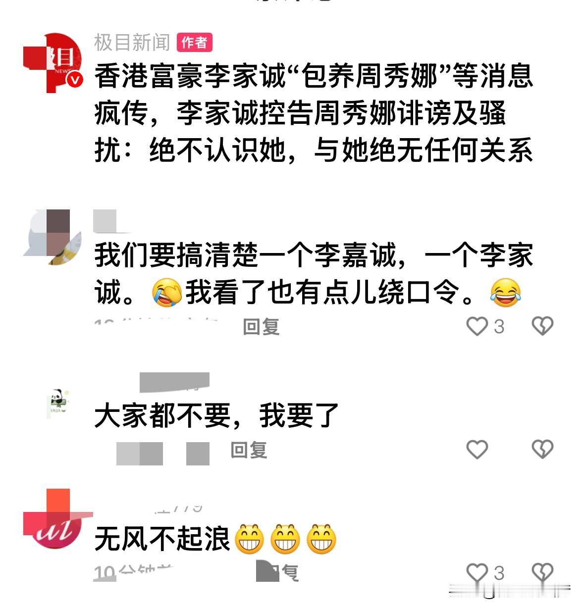 香港富豪李家诚怒告周秀娜!声明:绝不认识她,将追究到底! 近日,“香港富豪李家诚包养周秀娜”等消息在网上疯传!李家诚发声明控告周秀娜诽谤及骚扰,强调“绝不认识她”,更直指有理由相信她是整个失实传闻的策划源头。周秀娜则委屈回应,已公开否认此事。李家诚表示将委托律师跟进处理,坚决维权!事件持续发酵,真相究竟如何?持续跟进!
