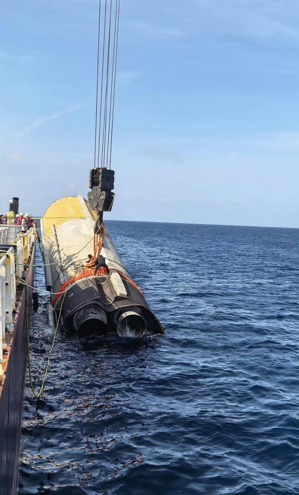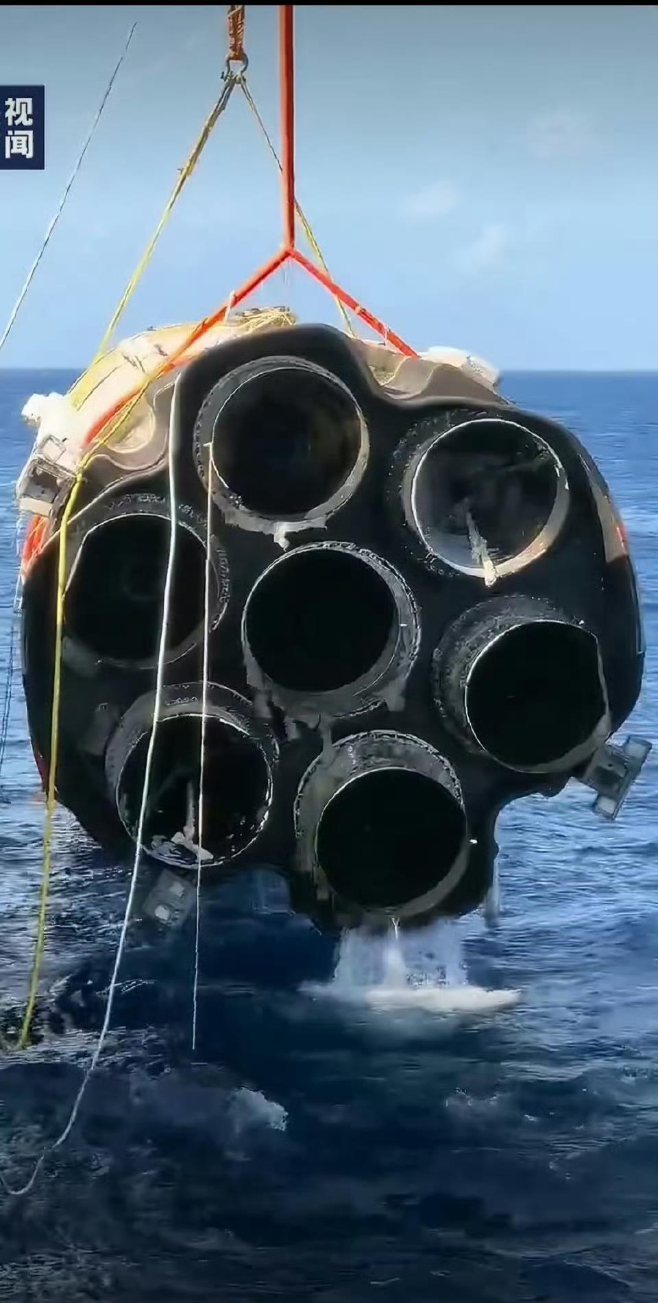 这枚被打捞的长10A火箭一级,是我国可复用火箭技术的关键试验样本。它专为重复使用设计,目标是实现10次以上复用,成本仅为新造的15%。此次打捞后,箭体防护膜完好率超95%,关键部件状态良好,检一修后具备再次升空潜力。 (图⑤是长10A溅落过程) 不过,本次任务的核心是验证海上网系回收技术,箭体将优先用于研究:分析海水浸泡与冲击对材料的影响,验证打捞、检测、修复等全流程可行性,为后续“天网捕箭”方案提供数据。它既是可复用火箭的“活化石”,也为载人登月任务的成本控制和技术迭代奠定了基础。