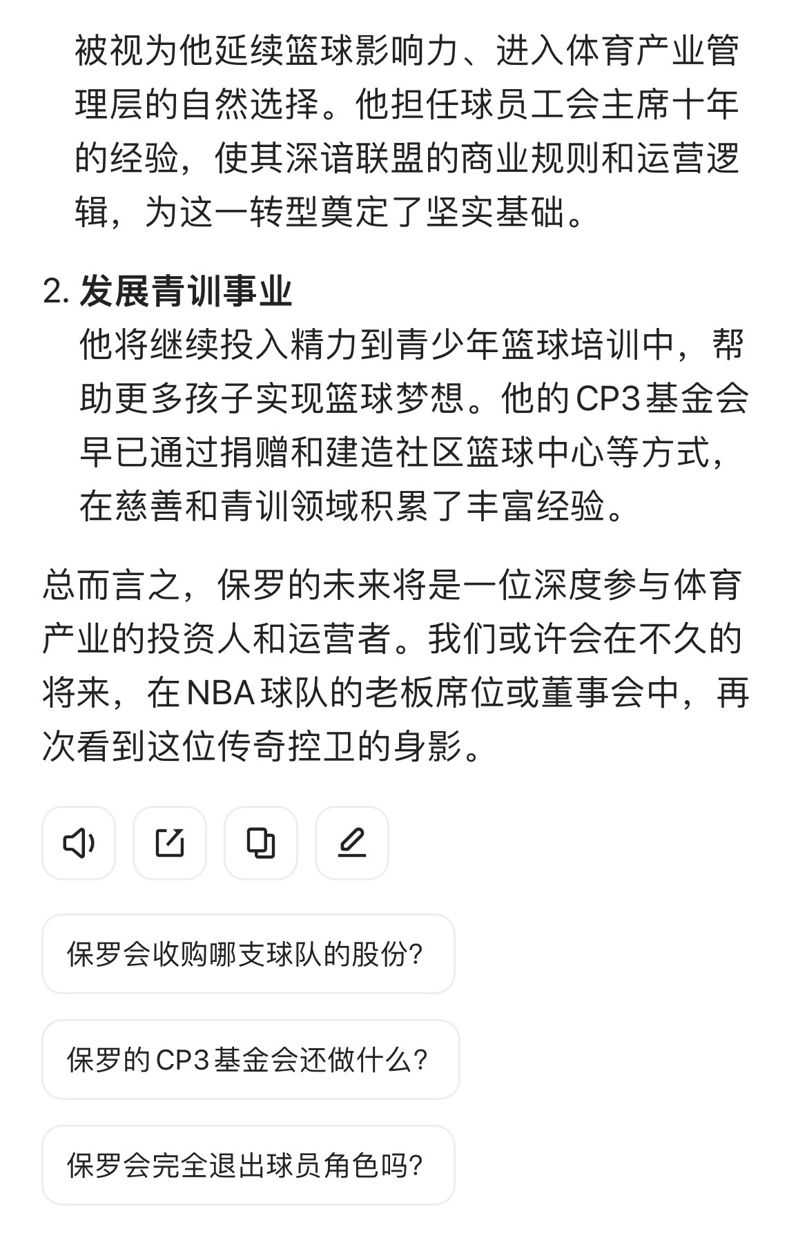 我发现ai真挺神的,作为保罗这样的球员退役后无非也就是这两个选择!但是我觉得保罗做NBA的主教练也够资格。控卫之神的代码重构体育AI过大年NBA