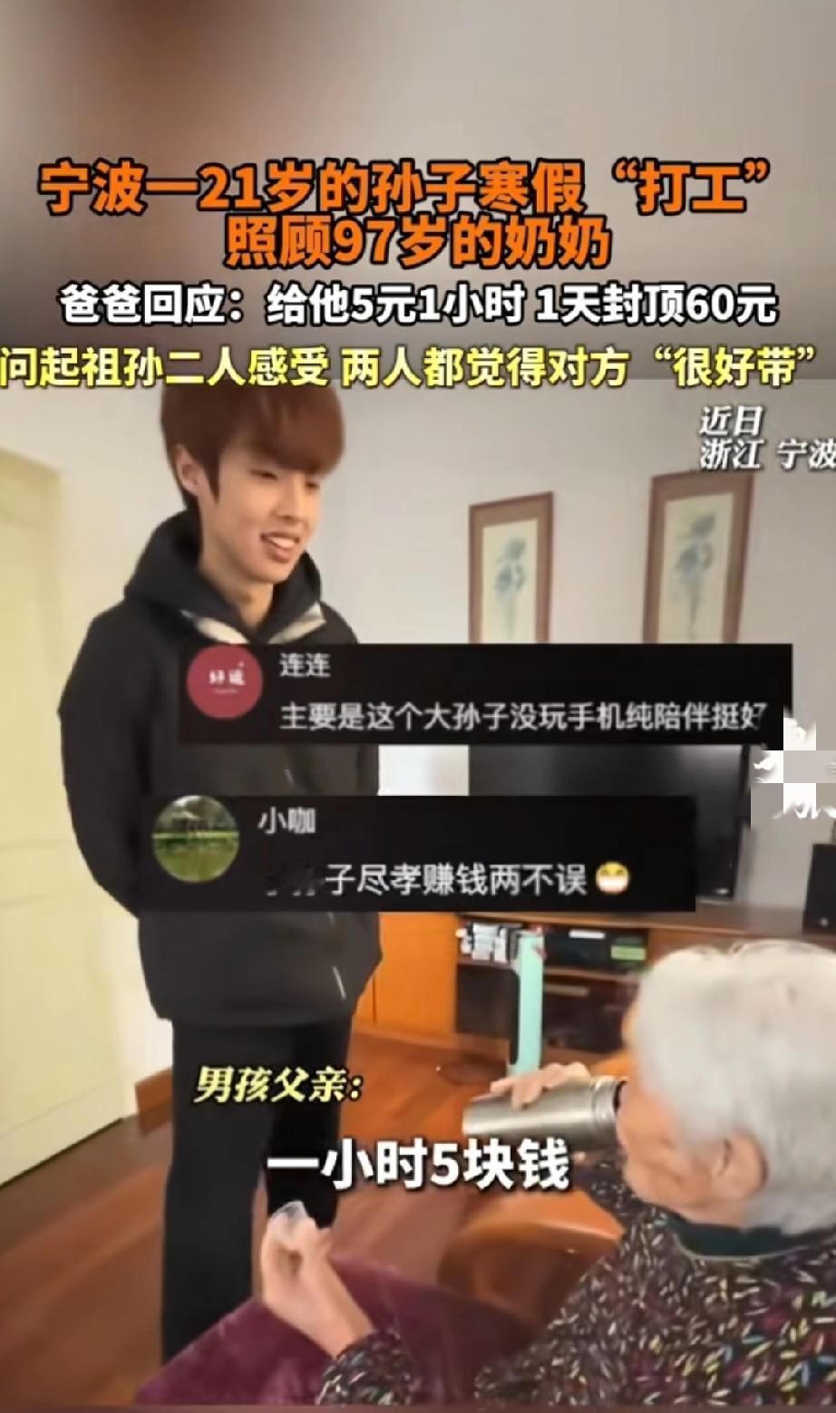 这挺好的,多方共赢,皆大欢喜! 孙子:奶奶没乱跑,这钱好赚! 奶奶:你放心,孙子不吵不闹,还给我端茶倒水,好带! 爸爸:结算的时候我还多给他10块,一天60块,这小子还挺乐呵。 儿子有人管,爸爸有班上,奶奶有人陪,真正意义上的三赢。[笑哭][笑哭][笑哭] 儿子挣工资