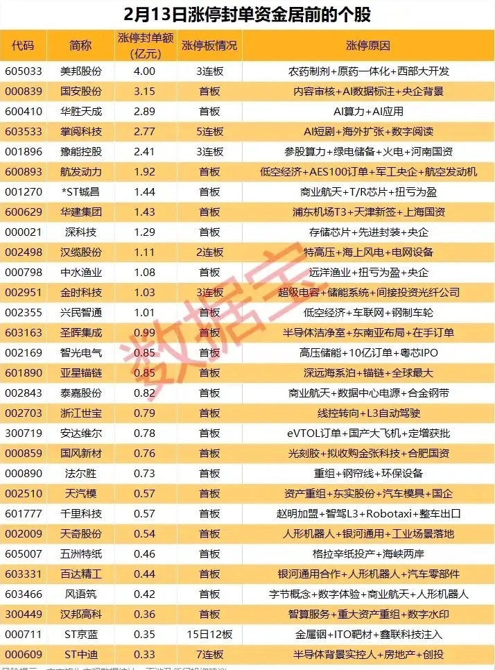 这些个股覆盖农药、AI算力、低空经济、储能等多个热点赛道,封单金额从0.33亿元到4.00亿元不等,多只个股连板,资金对高景气题材及央企背景标的偏好明显。个股梳理分析1. 美邦股份:农药行业,涨停封单4.00亿元,3连板,涨停原因是农药制剂+原药一体化+西部大开发,资金封单力度大,连板表现突出。2. 国安股份:传媒行业,涨停封单3.15亿元,首板,涨停原因是内容审核+AI数据标注+央企背景,AI+央企属性获资金青睐。3. 华胜天成:计算机行业,涨停封单2.89亿元,首板,涨停原因是AI算力+AI应用,算力赛道热度带动股价涨停。4. 掌阅科技:传媒行业,涨停封单2.77亿元,5连板,涨停原因是AI短剧+海外扩张+数字阅读,AI短剧催化下连板强势。5. 豫能控股:公用事业行业,涨停封单2.41亿元,3连板,涨停原因是参股算力+绿电储备+火电+河南国资,多重题材叠加获资金追捧。6. 航发动力:国防军工行业,涨停封单1.92亿元,首板,涨停原因是低空经济+AES100订单+军工央企+航空发动机,军工+低空经济双主线驱动。7. *ST铖昌:电子行业,涨停封单1.44亿元,首板,涨停原因是商业航天+铖昌T/R芯片+扭亏为盈,困境反转+航天题材获关注。8. 华建集团:建筑装饰行业,涨停封单1.43亿元,首板,涨停原因是浦东机场T3+天津新签+上海国资,基建+国资背景获资金青睐。9. 深科技:电子行业,涨停封单1.29亿元,首板,涨停原因是存储芯片+先进封装+央企,存储芯片复苏+央企属性驱动涨停。10. 汉缆股份:电力设备行业,涨停封单1.11亿元,2连板,涨停原因是特高压+海上风电+电网设备,特高压+风电双赛道催化。11. 中水渔业:农林牧渔行业,涨停封单1.08亿元,首板,涨停原因是远洋渔业+扭亏为盈+央企,业绩反转+央企背景获资金关注。12. 金时科技:电力设备行业,涨停封单1.03亿元,3连板,涨停原因是超级电容+储能系统+间接投资光纤公司,储能+超级电容题材连板。13. 兴民智通:汽车行业,涨停封单1.01亿元,首板,涨停原因是低空经济+车联网+钢制车轮,低空经济+车联网双主线驱动。14. 圣晖集成:电子行业,涨停封单0.99亿元,首板,涨停原因是半导体洁净室+东南亚布局+在手订单,半导体配套+海外拓展获关注。15. 智光电气:电力设备行业,涨停封单0.85亿元,首板,涨停原因是高压储能+10亿订单+粤芯IPO,储能订单+半导体参股驱动。16. 亚星锚链:机械设备行业,涨停封单0.85亿元,首板,涨停原因是深远海系泊+锚链+全球最大,深海装备+行业龙头获青睐。17. 泰嘉股份:机械设备行业,涨停封单0.82亿元,首板,涨停原因是商业航天+数据中心电源+合金钢带,航天+数据中心双题材驱动。18. 浙江世宝:汽车行业,涨停封单0.79亿元,首板,涨停原因是线控转向+L3自动驾驶,智能驾驶技术迭代获关注。19. 安达维尔:机械设备行业,涨停封单0.78亿元,首板,涨停原因是eVTOL订单+国产大飞机+定增获批,低空经济+大飞机双主线。20. 国风新材:化工行业,涨停封单0.76亿元,首板,涨停原因是光刻胶+拟收购金张科技+合肥国资,光刻胶+国资整合获资金关注。21. 法尔胜:金属制品行业,涨停封单0.73亿元,首板,涨停原因是重组+钢帘线+环保设备,重组预期+环保属性驱动。22. 天汽模:汽车行业,涨停封单0.57亿元,首板,涨停原因是资产重组+实控人+汽车模具+国企,重组+国企背景获青睐。23. 千里科技:计算机行业,涨停封单0.57亿元,首板,涨停原因是赵明加强+智驾L3+Robotaxi+整车出口,智驾+出口双主线驱动。24. 天奇股份:机械设备行业,涨停封单0.54亿元,首板,涨停原因是人形机器人+银河通用+工业场景落地,人形机器人+工业应用获关注。25. 五洲特纸:轻工制造行业,涨停封单0.46亿元,首板,涨停原因是格拉辛纸投产+海峡两岸,产能释放+区域合作获关注。26. 百达精工:机械设备行业,涨停封单0.44亿元,首板,涨停原因是银河通用合作+人形机器人+汽车零部件,机器人+汽车零部件双题材。27. 风语筑:传媒行业,涨停封单0.42亿元,首板,涨停原因是字节概念+数字体验+商业航天+人形机器人,多题材叠加获资金青睐。