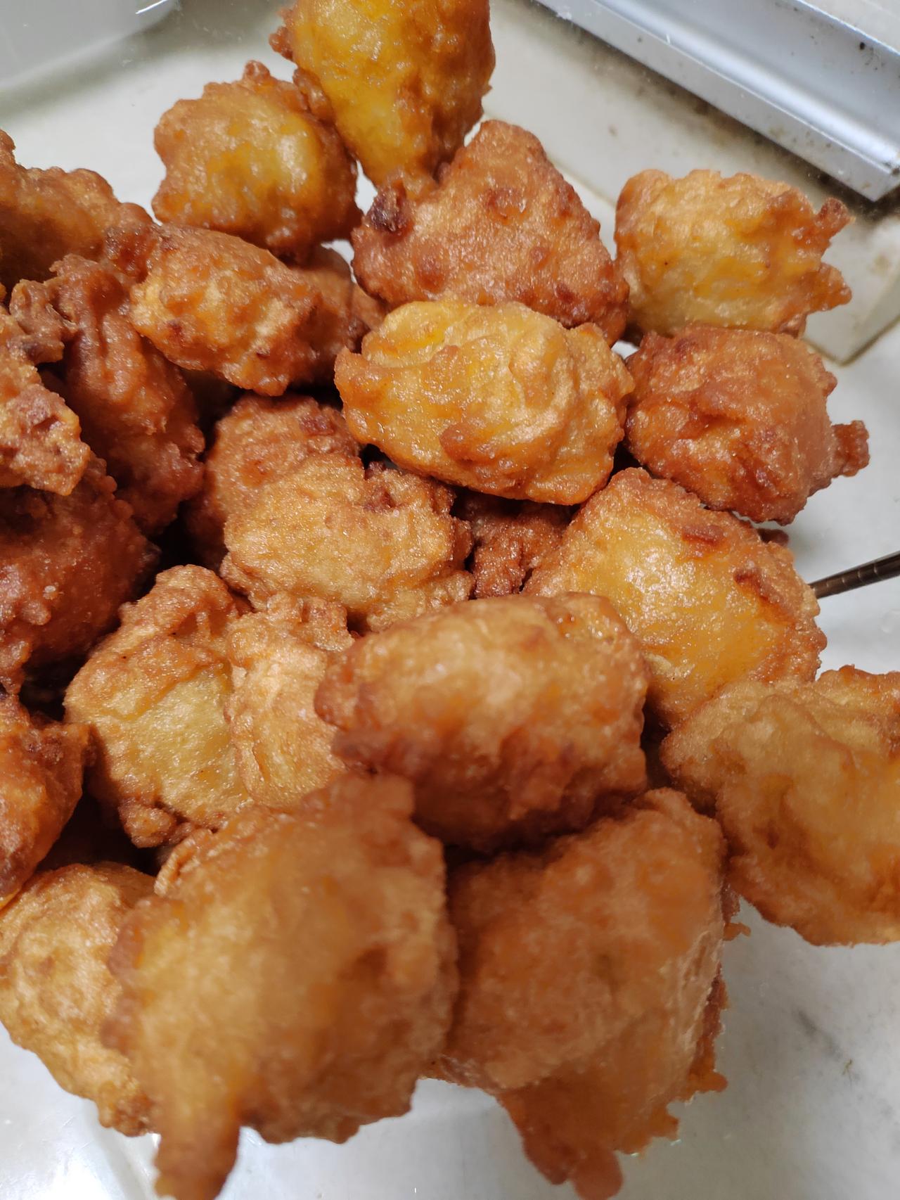 过年你们家会炸丸子吗?虽然这事工程浩大,但每年春节,我都会炸一点,算是过年的仪式感吧。 一般我会炸萝卜、苹果和红枣三种丸子,其中Z受欢迎的是萝卜丸子,做法也很简单。 先将萝卜和胡萝卜擦成宽一点的丝,然后加白糖或者精盐杀出水分,过清水后攥干成团,再用菜刀切几刀,注意不要切太碎。 然后将萝卜丝与面粉混合,加入精盐和十三香调味,再注入适量温水,面糊不能太干,这样炸出来的丸子才会酥软。 炸丸子是否成功,油温控制也很关键。这里推I荐用大豆油炸丸子,油的沸点较高,可以将丸子内部炸透。 炸的时候锅不能一直开大火,油热后要调小火苗,然后放入丸子,定型后再用漏勺轻轻推动,让丸子各部分受热均匀。这样炸出来的丸子会外焦里嫩,非常好吃。 新的一年马上到了,祝大家幸福圆I满。