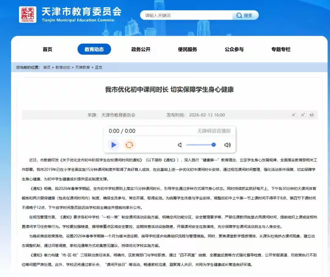 新规落地,天津出台初中上课时间刚性规定。践行“健康第一”教育理念,立足学生身心发展规律,市教委《关于优化全市初中阶段学生在校课间时间的通知》印发。天津优化初中课间时长:上午第一节上课时间不得早于8点,第四节下课时间不得晚于12点。课间休息时间不低于15分钟。 评:天津市教委明确初中上课规范,上午首课不早于8点、第四节下课不晚于12点,延长课间并保障体育锻炼,直击学生睡眠不足、运动欠缺的痛点。这一规定把身心健康置于优先位置,是落实减负、回归育人本质的务实举措。充足睡眠与适度活动,是学习效率与成长发育的基础。政策的生命力在于执行,学校应严格落实,不搞提前到校、不挤占休息与运动时间。以刚性制度守护成长底线,让教育更有温度,更利于学生长远发展。天津 社会热点 践行“健康第一”教育理念天津新规落地 《关于优化全市初中阶段学生在校课间时间的通知》印发