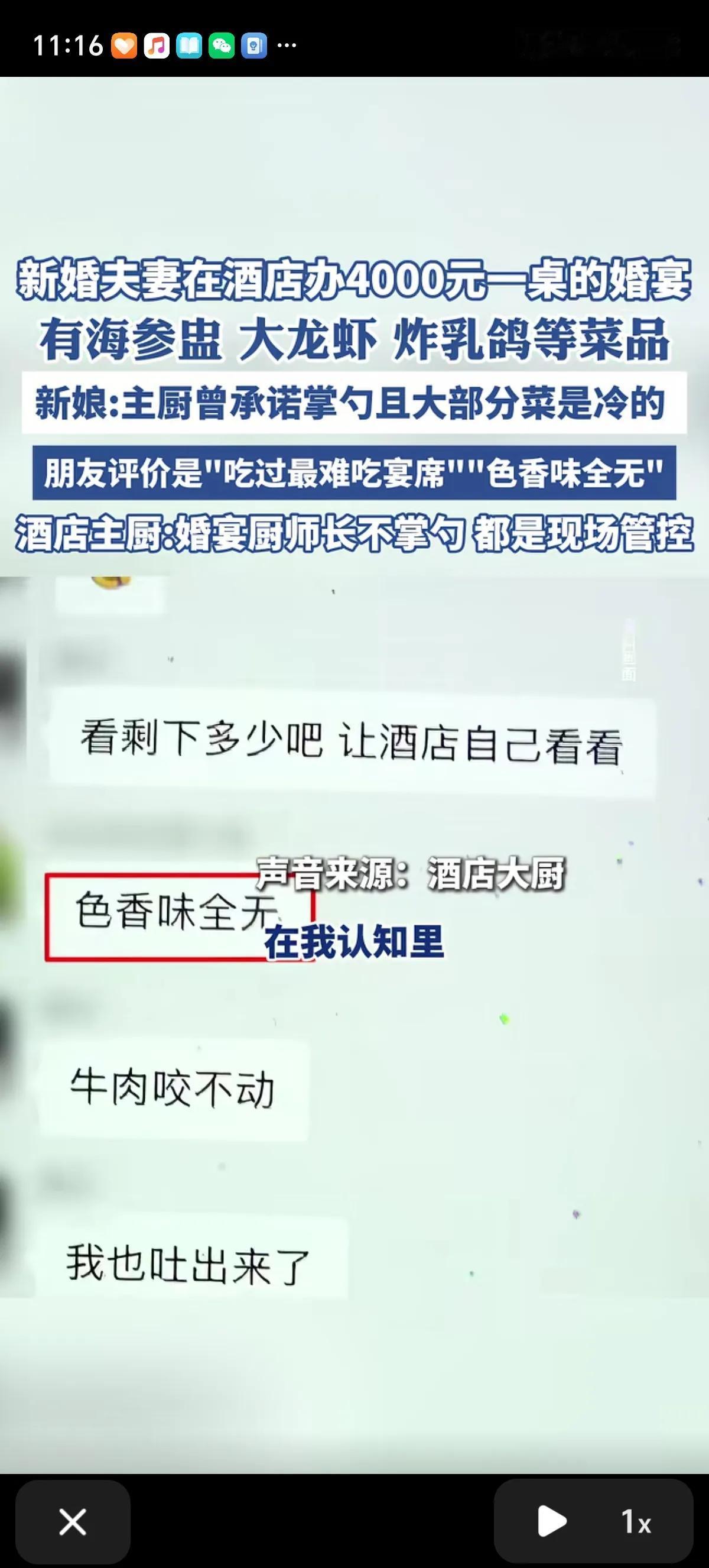 新婚夫妇办4000元一桌的的婚宴想让亲戚朋友吃好喝好,结果成了大型翻车现场。菜是冷的,没有热乎气。朋友说“吃过最难吃宴席”,“色香味全无”。 这是一场在浙江金华的婚宴,新婚夫妻摆了11桌席面,单桌价格3988元(近4000元),菜单包含海参盅、大龙虾、炸乳鸽、两头乌、蒸扇贝等“硬菜”。 亲友普遍反馈大部分菜品是冷的,尤其是大龙虾等海鲜,完全没有热气。 牛肉等肉类咬不动,食材缩水,整体“色香味全无”,被评价为“吃过最难吃的宴席”。 黄女士表示,订酒店时主厨曾当面承诺婚宴当天由他亲自掌勺,但实际并未兑现。 酒店主厨回应称,婚宴厨师长不掌勺,只负责现场管控,否认了“主厨掌勺”的承诺。 新娘黄女士说:牛肉就是硬的,咬不动,菜品很多是冷的、是凉的。 酒店大厨说:刚开始是说波龙没肉,第二说螃蟹是死的,然后又说所有的菜要让我本人烧的,在我的认知里,这个人就不讲道理。 新娘在婚宴现场就向酒店提出交涉,但相关负责人态度消极,甚至直接离场。 酒店餐饮总监在电话中否认菜品有问题,仅愿意补偿2000元代金券,拒绝现金赔偿。 新娘要求退还5000元作为补偿,双方目前仍未达成一致。