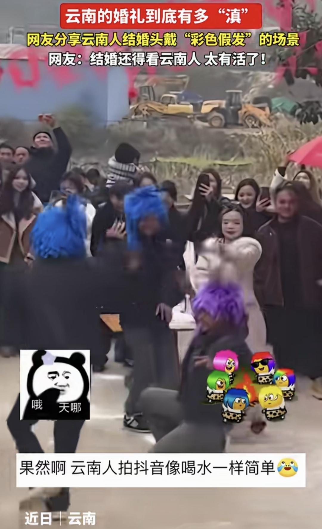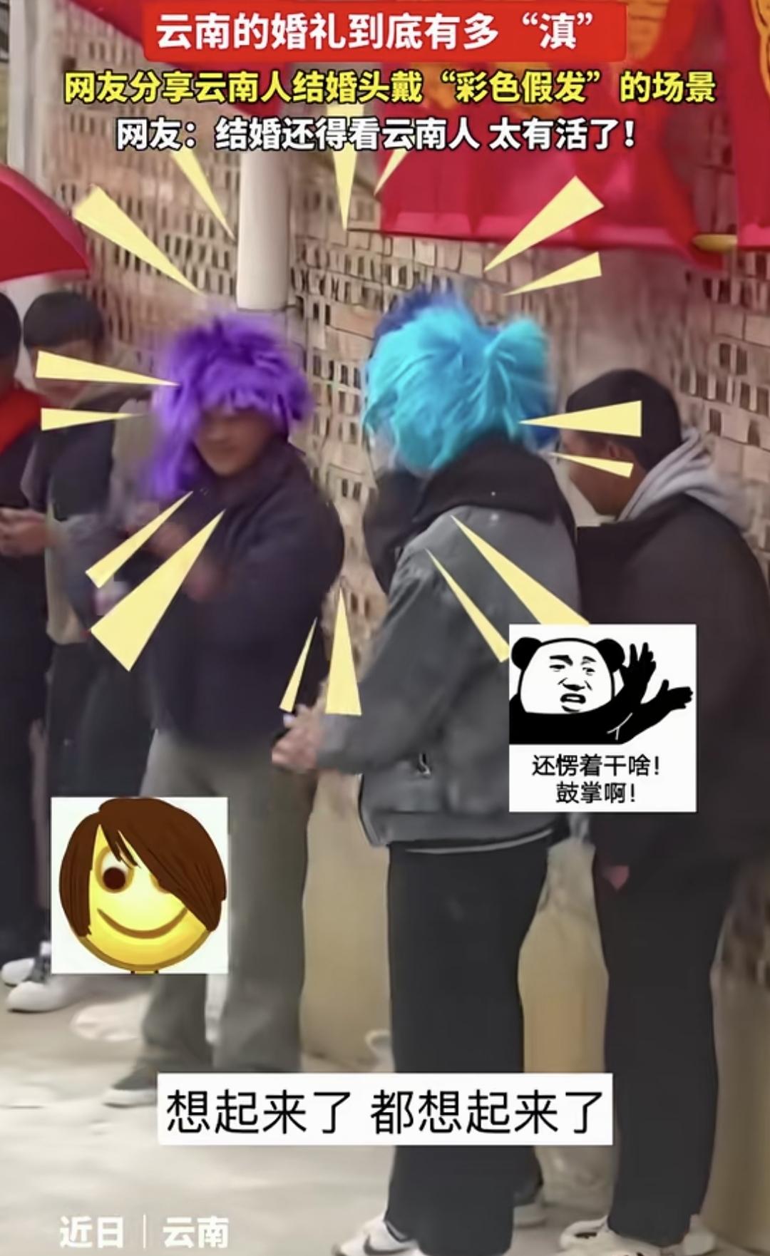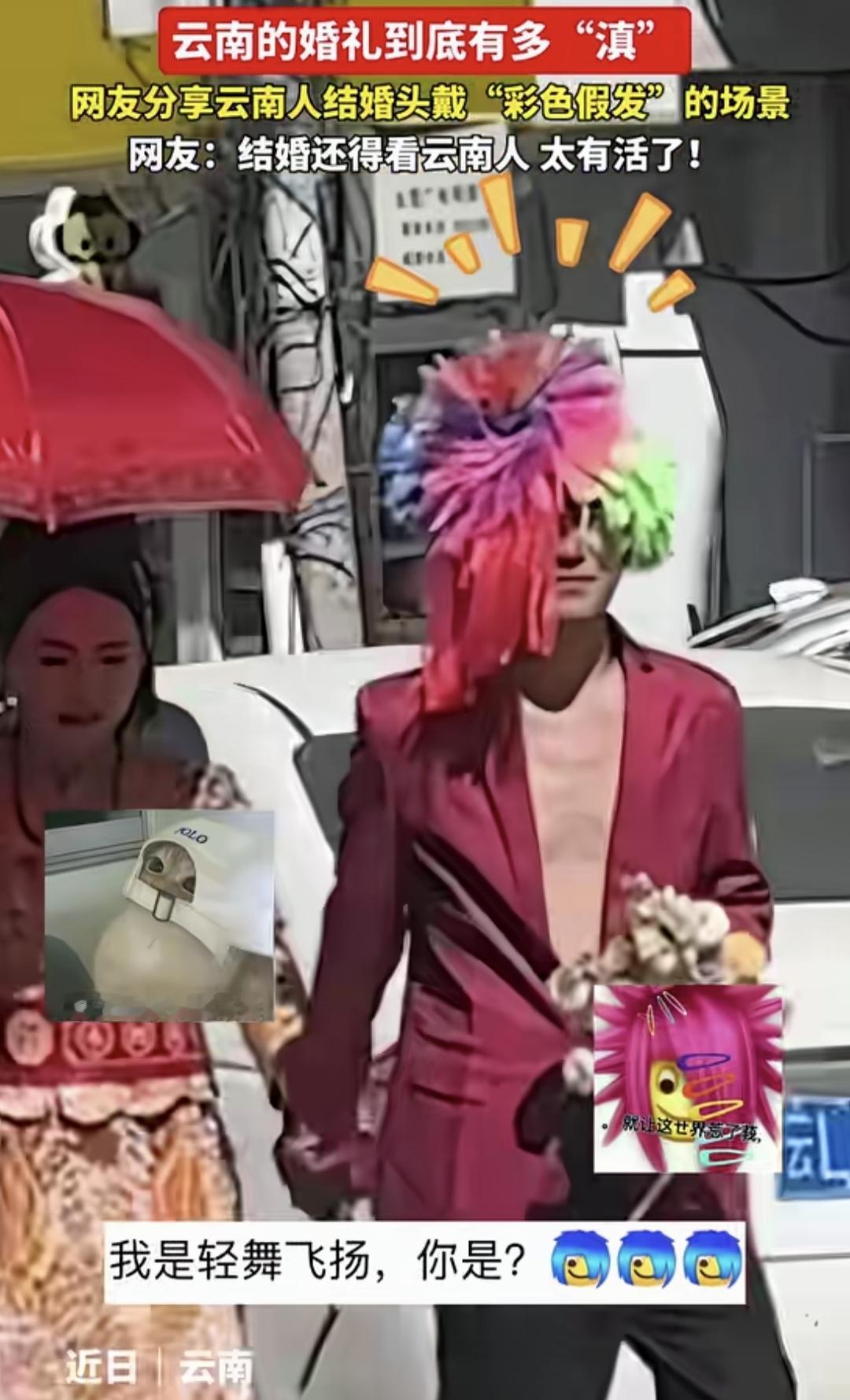 这是云南某地的婚礼现场,看这五颜六色的头发,这杀马特的造型,是不是满满的回忆。 新郎这个造型简直就是行走的显眼包啊,就是不知道他的父母还有岳父母有没有私底下骂他。 他能在村里成为大家嘴里的谈资好久了!