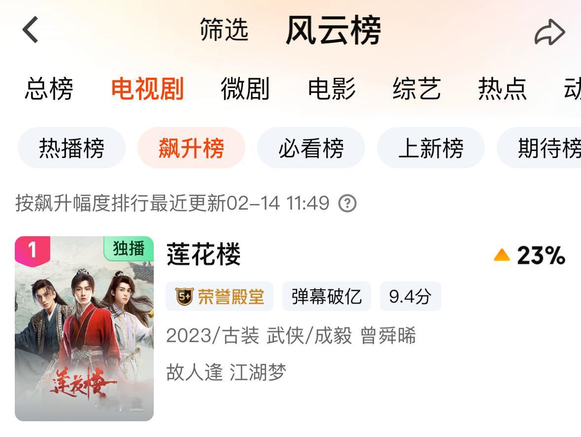 今天什么日子?爱奇艺站内莲花楼飙升榜第一,长尾真好。腊月二七,莲络人赴东海,捞李门主,剧粉好长情。