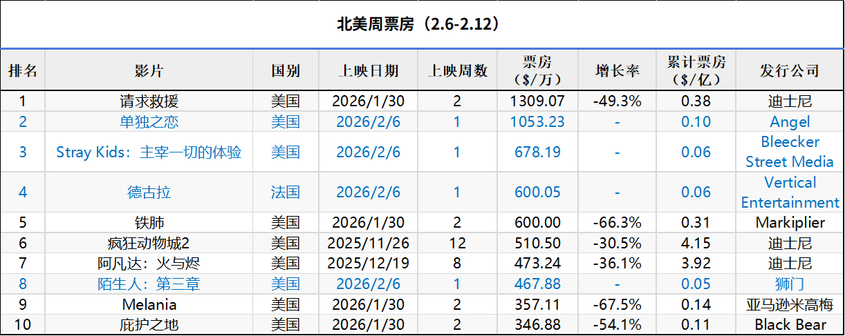 2026年第6周北美票房 :1.《请求救援》蝉联冠军,暂列2026新片全球冠军;2. 爱情片《单独之恋》在新片中表现最佳;3.《疯狂动物城2》全球票房突破18亿美元,位列影史第9。(数据:boxofficemojo)