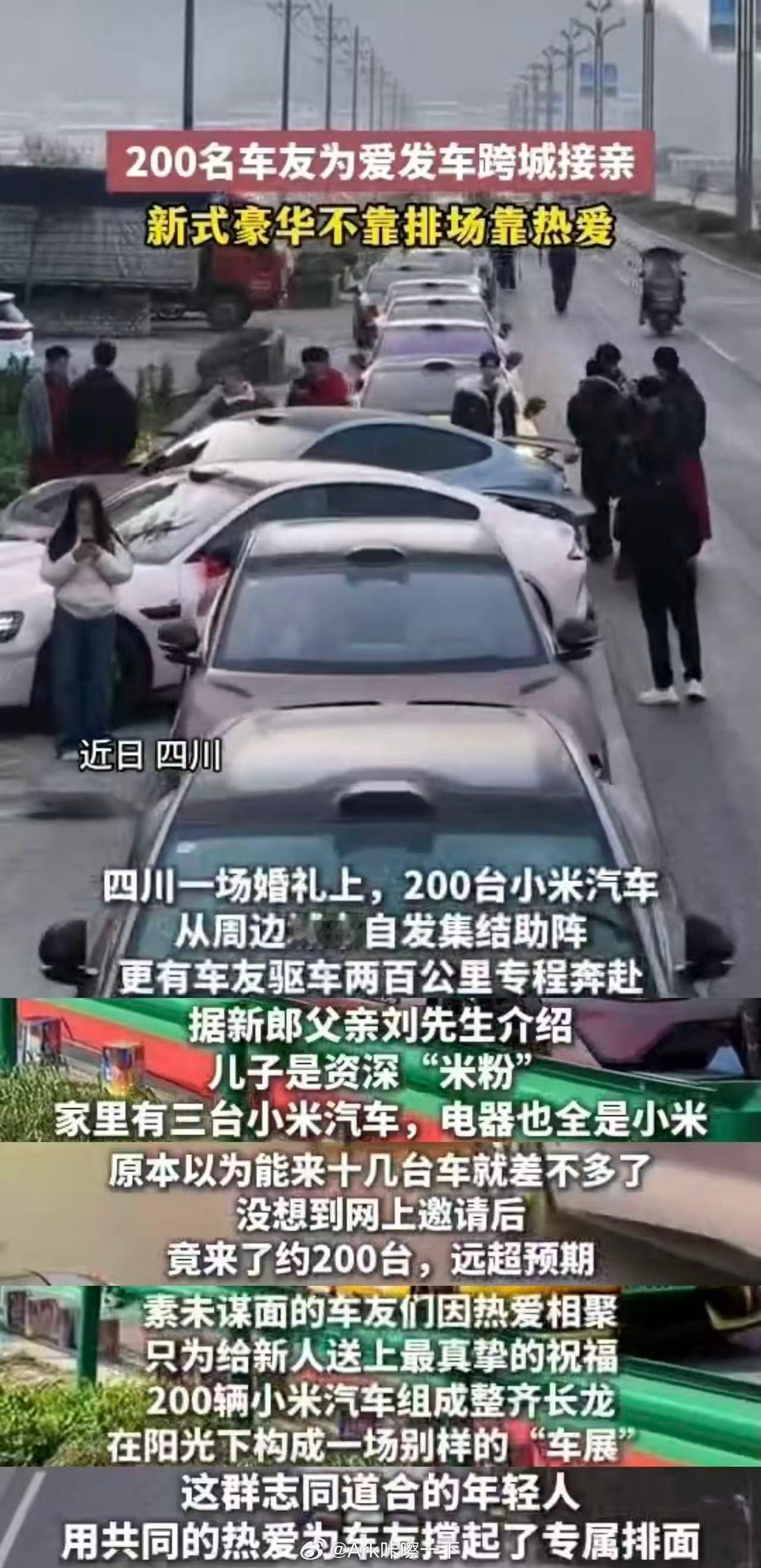 200名车友为爱发车跨城接亲这两天结婚的贼多,在四川就有一对小米SU7车主结婚,居然集结了200台小米汽车一起做婚车,这阵仗不比迈巴赫更吸睛?