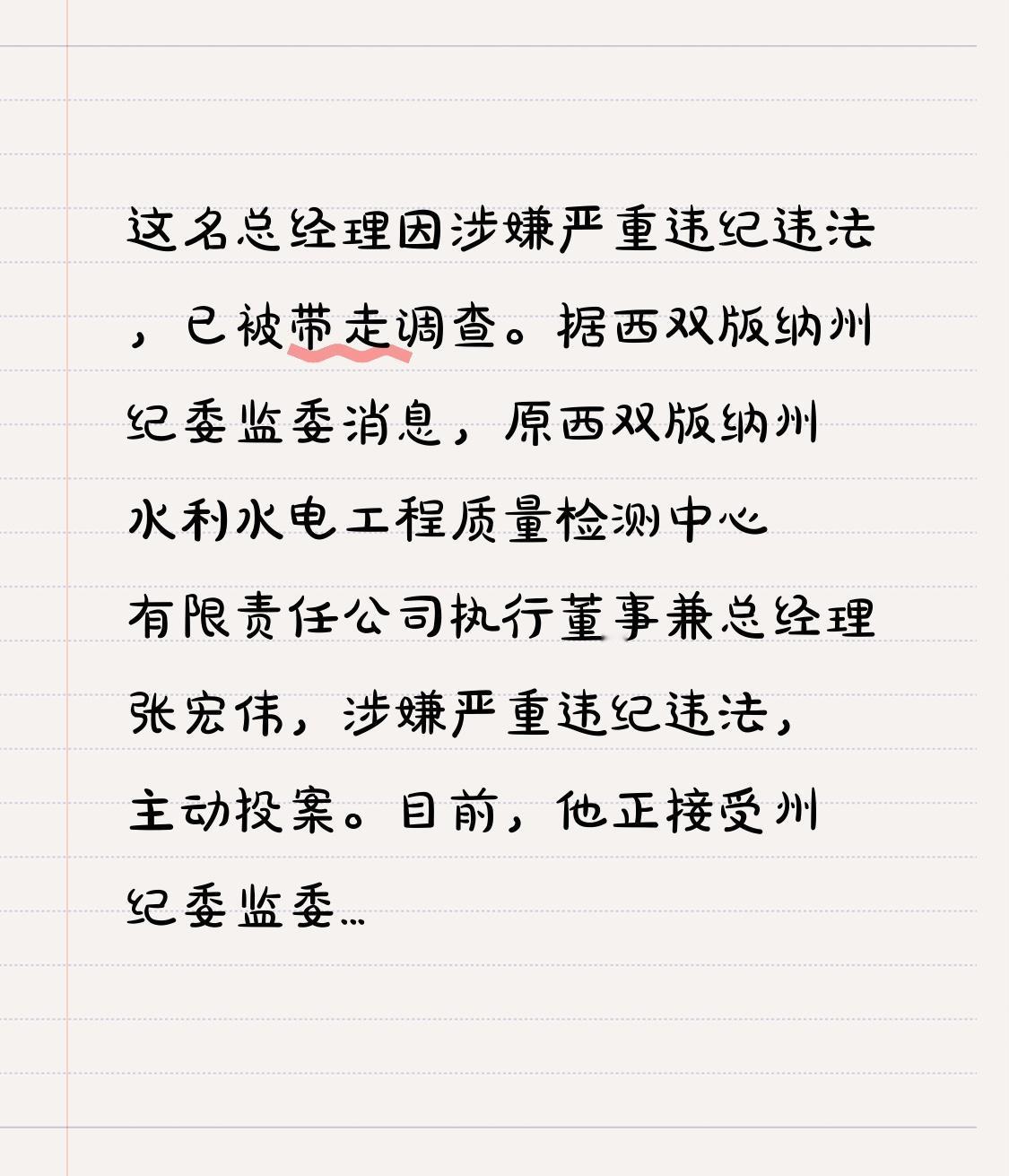 这名总经理因涉嫌严重违纪违法,已被带走调查。 据西双版纳州纪委监委消息,原西双版纳州水利水电工程质量检测中心有限责任公司执行董事兼总经理张宏伟,涉嫌严重违纪违法,主动投案。 目前,他正接受州纪委监委驻州财政局纪检监察组的纪律审查。经西双版纳州监委指定,由勐海县监委管辖,他正接受勐海县监委的监察调查。 权威发布 西双版纳