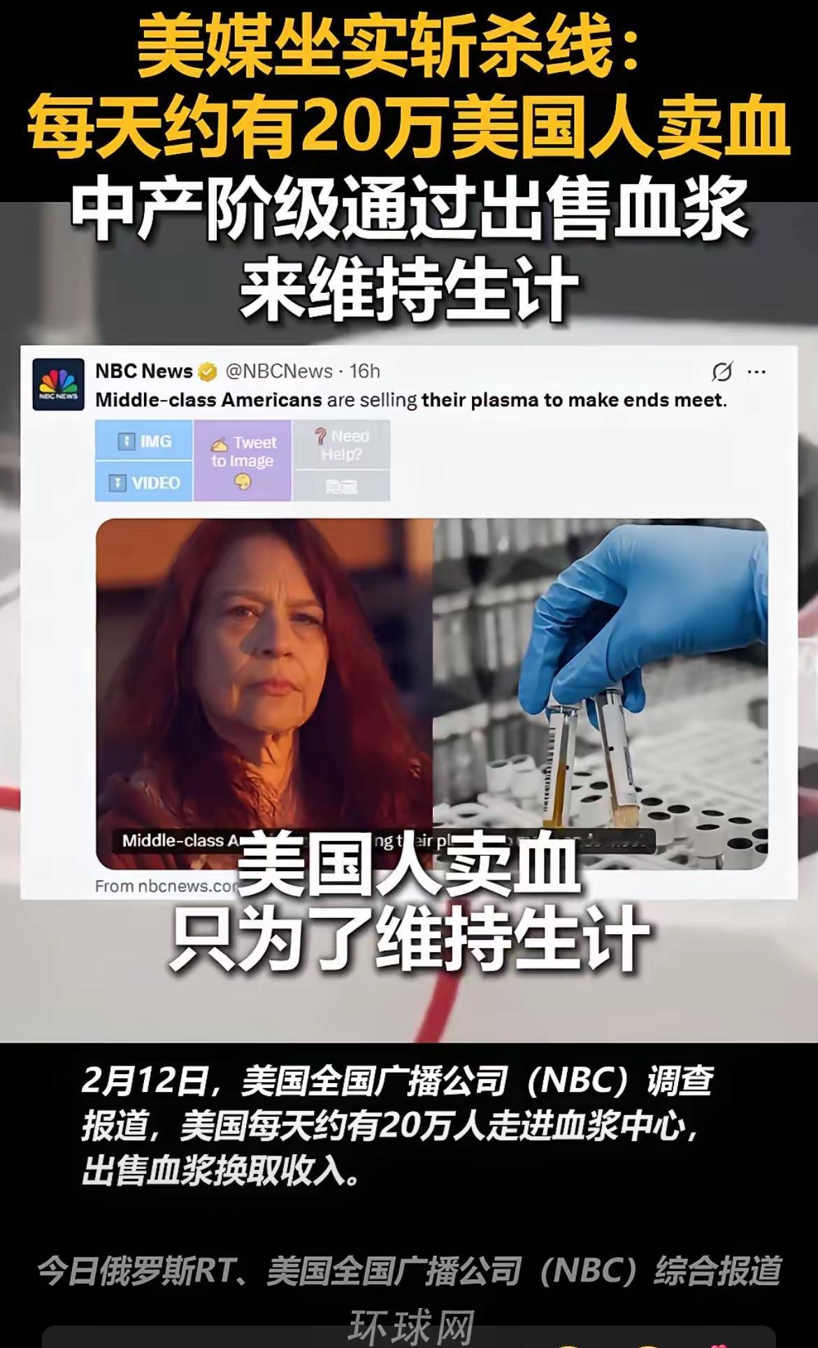 美国斩杀线再次在美国国内中登上热搜,这次是美国媒体坐实了这件事。 美媒调查发现,美国每天有20万人去卖血来获取收入,只为了能够去交房租和维持生计。就算年薪8.7万美元的财务高管,被裁员后,每周去工作超过80小时,还得去一周卖两次血,获得400美元,这样都还没有能付清账单,从精神和肉体上完全把人榨干。 有网友评论:美国普通百姓的生活如此艰辛,但几十年来很少有人揭露。某些媒体把那里夸成一朵花。 资本主义本质就是新奴隶主义。只是平民有表面的人身自由,其实终身都是资本的奴隶而他们不知到摆了,还在高兴的宣称我们是自由社会,人权国家。 对此,你怎么看?