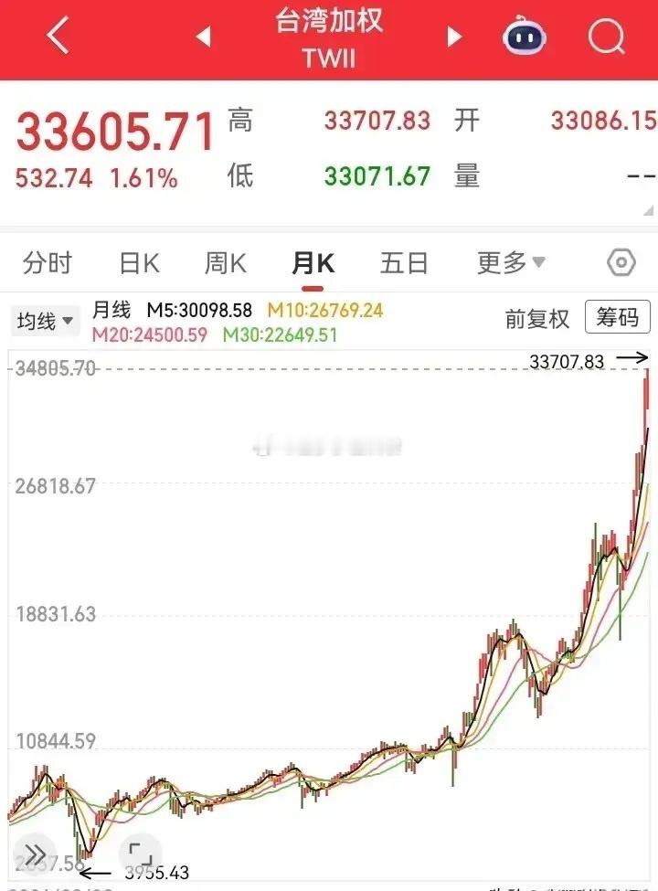 小湾湾的走势还是挺猛的!走出了长达十年的长牛行情,近20年累计涨幅接近10倍,这样的表现在全球市场中都名列前茅,十年持续上行更是难得一见。春节前其市场势头尤为凶猛,指数接连走高、不断刷新历史纪录,这波强势行情,和当地科技企业的亮眼业绩深度绑定,尤其是半导体领域的龙头企业,对指数的拉动作用十分显著。从技术形态来看,当前台股正运行在第五浪,仍处于加速赶顶阶段。这波行情的顶点何时到来,关键要看台积电等核心电子大厂的盈利表现——一旦这些龙头企业业绩不及预期,市场大概率会迎来大幅调整。没有只涨不跌的市场,一旦上行动能枯竭、涨势停滞,原本的多头资金会迅速转向空头、抢先出逃,行情反转的速度会非常快。这就好比田径赛跑,选手临近终点时都会全力冲刺,股市加速赶顶也是同样的道理。所以现阶段,理性观望、静观其变,是更稳妥的选择。