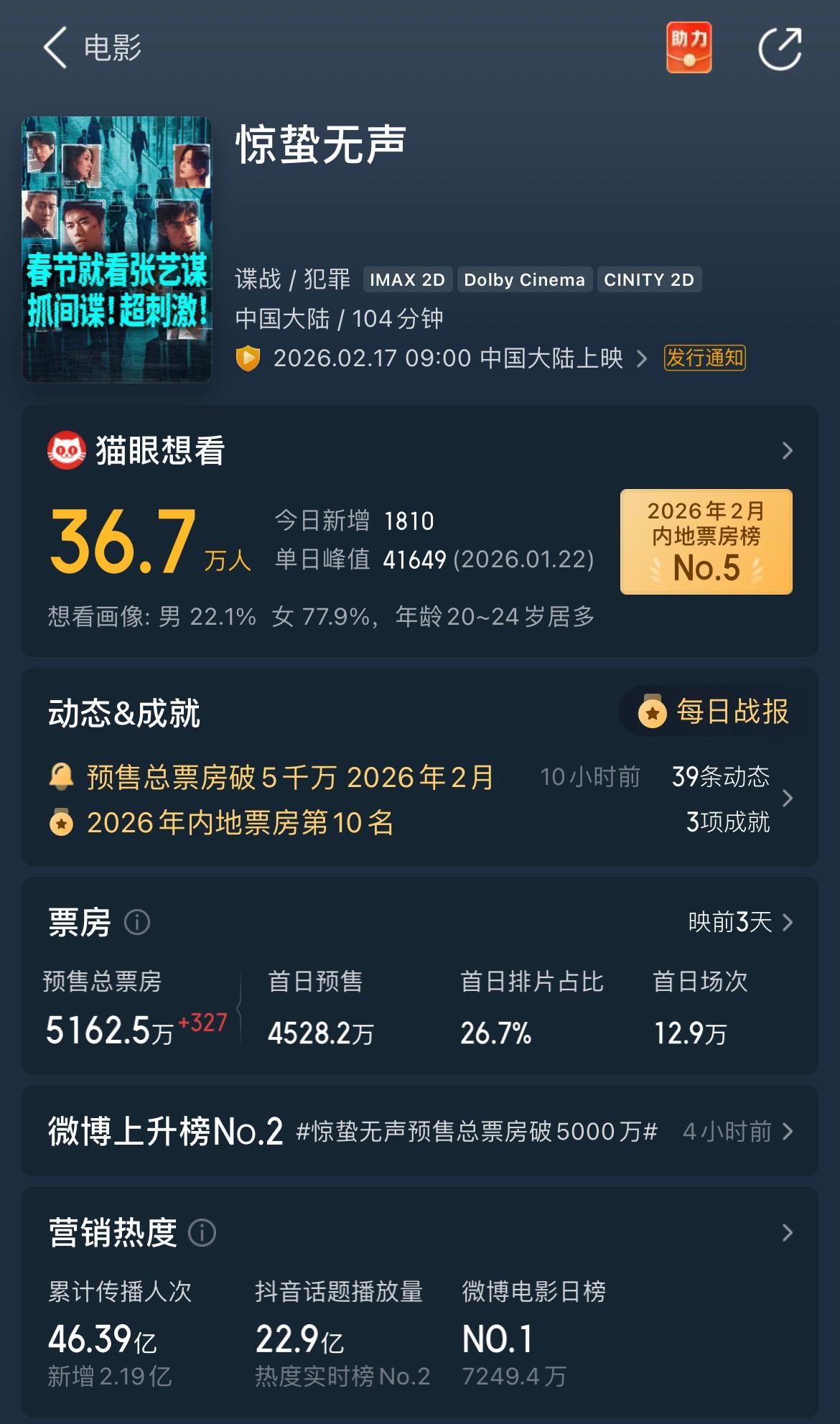 《惊蛰无声》预售破5000w,还有3天就要上映了,感觉预售破亿有点难,不过最吸引我的还是刘诗诗的小玉,很期待刘诗诗首次合作大导张艺谋的电影