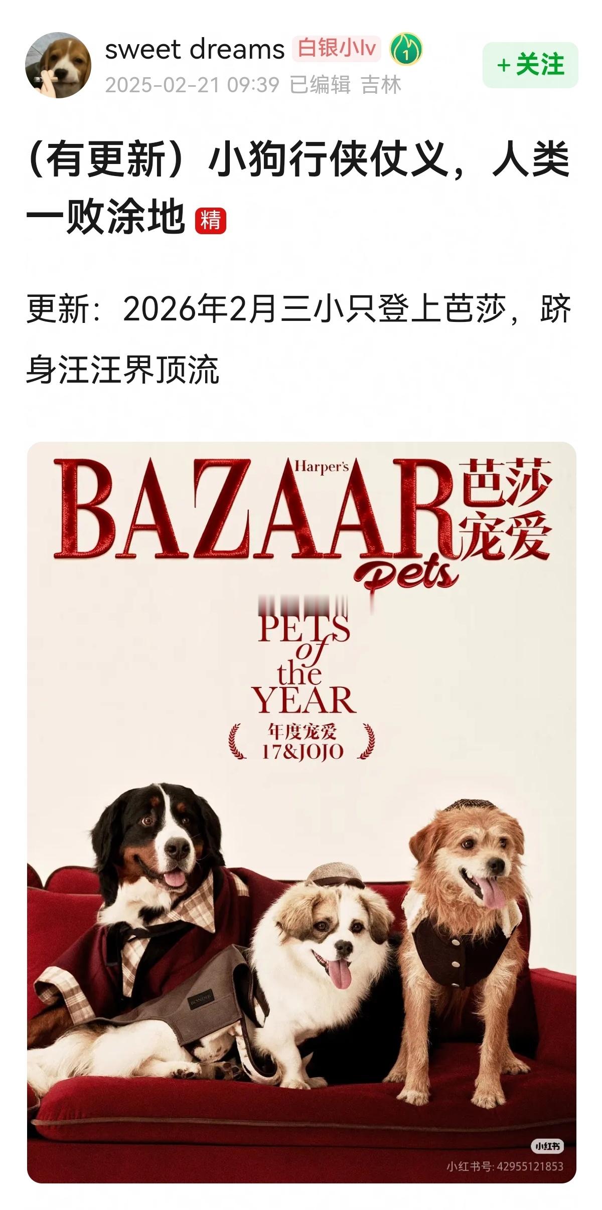 还记得这三只狗狗的故事吗?今年2月三小只登上芭莎,跻身汪汪界顶流→“小狗行侠仗义,人类一败涂地”