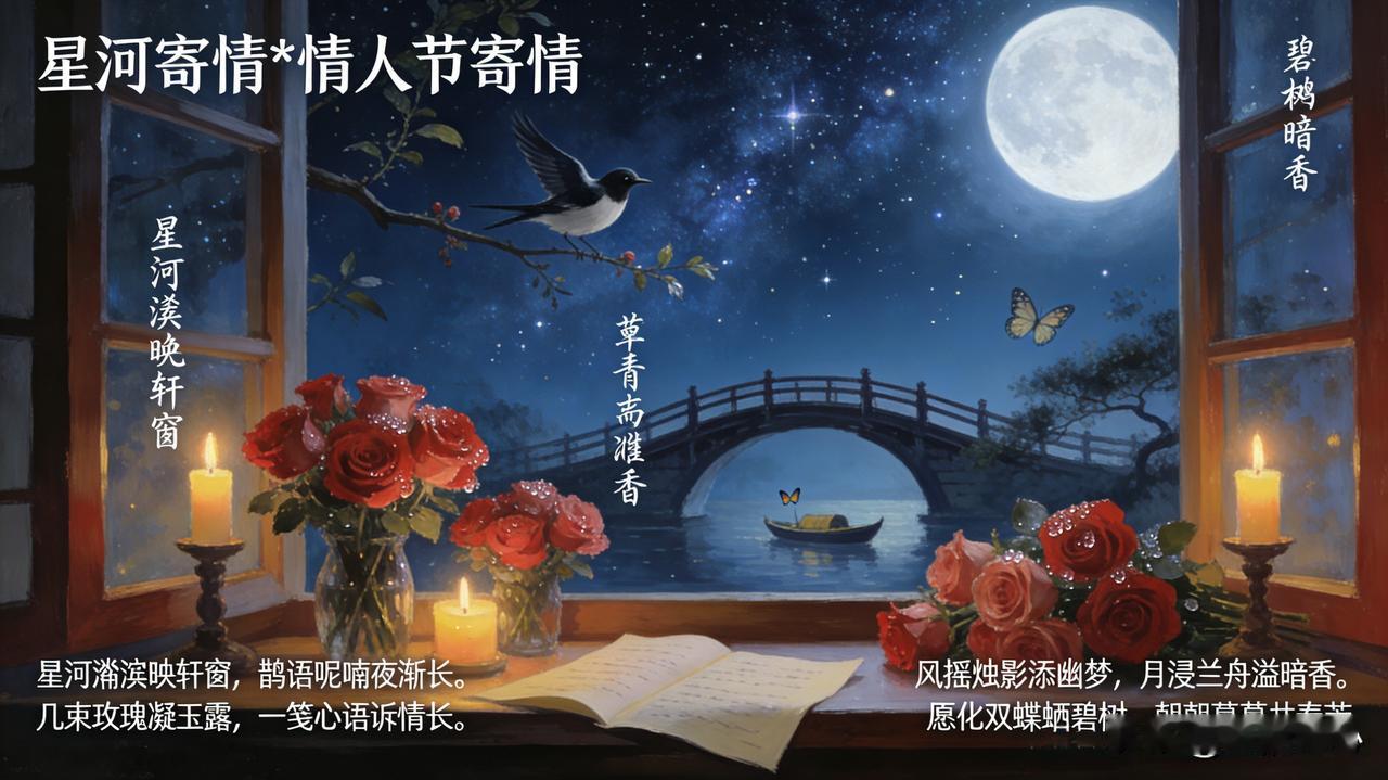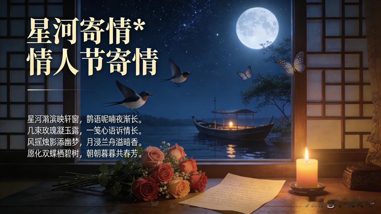 《星珂寄情*情人节寄情》乐韵诗心原创诗词: 星河潋滟映轩窗, 鹊语呢喃夜渐长。 几束玫瑰凝玉露, 一笺心语诉情长。 风摇烛影添幽梦, 月浸兰舟溢暗香。 愿化双蝶栖碧树, 朝朝暮暮共春芳。 这首诗以情人节夜色为背景,开篇以星河鹊语渲染浪漫氛围,再借玫瑰、书笺传递心意,烛影兰舟烘托缱绻意境,最后以化蝶并栖的典故,直白吐露朝朝暮暮相守的期盼,将爱情的真挚与绵长融于每一处细节。