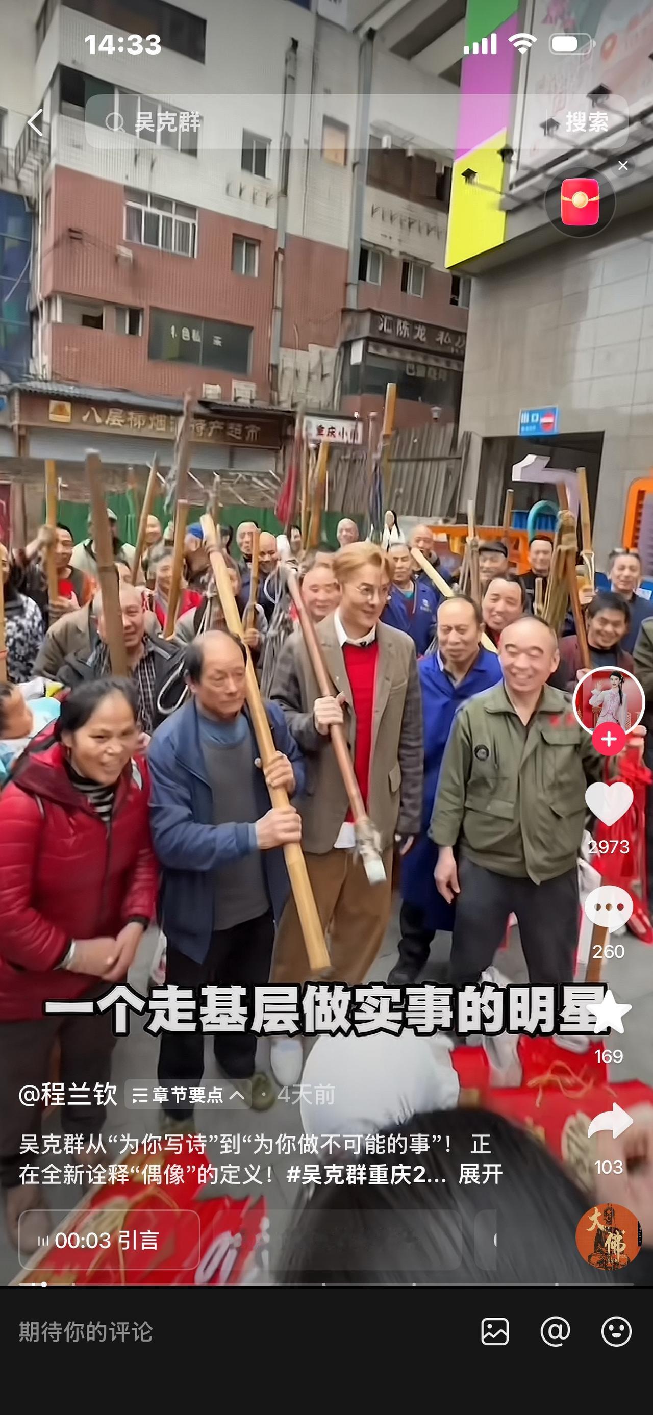 吴克群真是让人刮目相看!以前只知道他是歌手,《为你写诗》火遍大江南北。后来他似乎“不务正业”,不专心搞音乐,却和农民、基层百姓打得火热。 2月9 - 11日这三天,他到重庆和棒棒、环卫工唠家常发红包,办24小时不打烊年夜饭,还帮菜农售出3万斤蔬菜并牵线长期收购。其实早在之前,他就关注到菜农困境,坐公交看到老人辛苦,拍视频后直接帮菜农对接超市和餐厅。他不是作秀,是真为百姓做事。这样的吴克群,活该被百姓高高举起! 吴克群出场费 吴克群清唱 瓷都吴克群 周克群