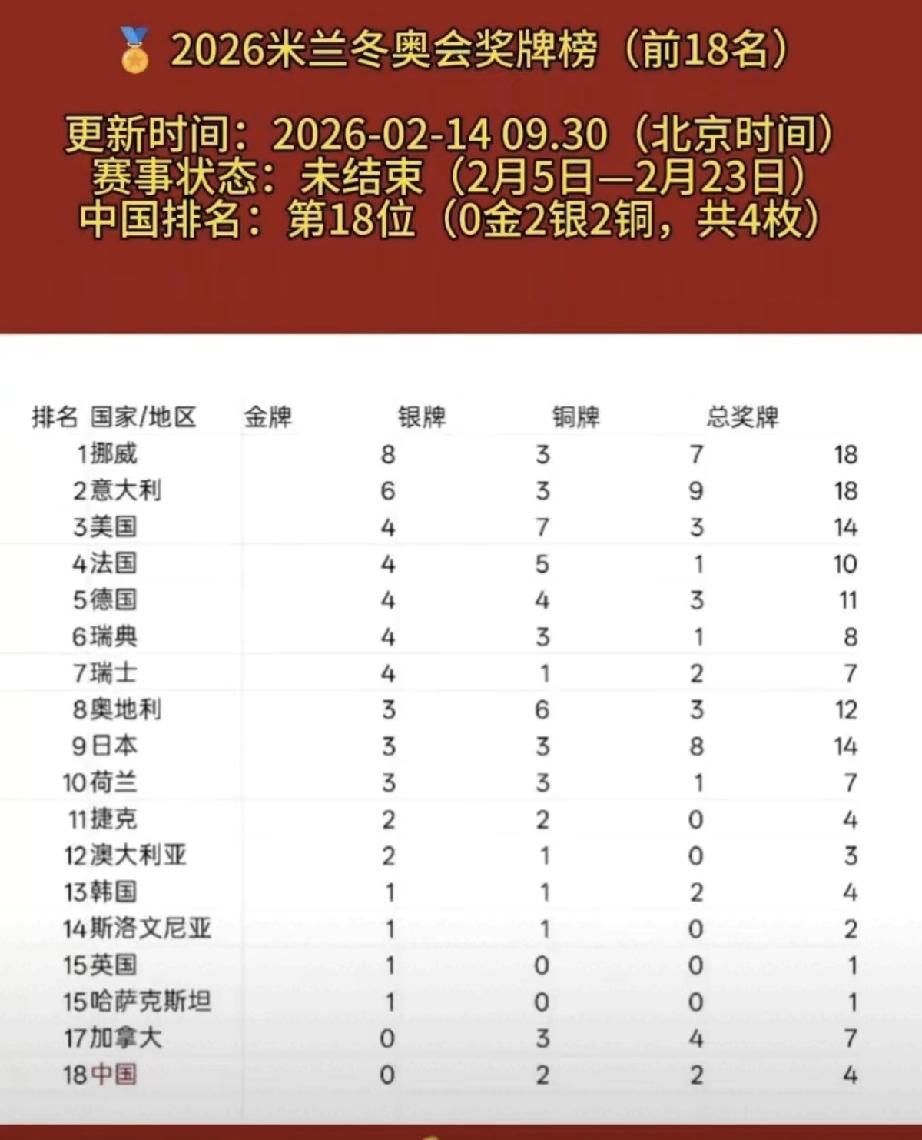 很难想象,中国作为夏季奥运会的“二当家”,在冬奥会成绩却不如日本和韩国……! 米兰冬奥会赛程已经过去了大半,中过队金牌🥇为零,仅仅获得2银2铜总共4枚奖牌,排名奖牌榜第18名,而且从目前的竞争状态来看,中国队的首金还是遥遥无期……! 日本队目前已经获得3金3银8铜总共14枚奖牌,赛季奖牌榜第9位,这也是唯一挤进前10的亚洲国家,日本在夏季奥运会也能排进前10,这也充分说明了日本队的综合实力雄厚,不偏科,均衡发展! 韩国队目前获得1金1银2铜总共4枚奖牌,排名第13位,虽然奖牌数量不多,但好歹有金牌入账,韩国在夏季奥运会也能挤进前15-20名,其体育水平也不低! 我就纳闷了,中国队在夏季奥运会那是唯一可以和美国掰手腕的国家,甚至在北京奥运会超过了美国排名第一,但是历届冬奥会都很难,获得奖牌都很难,更不要说金牌了!中国的东三省,河北,山东,内蒙古都处于冰雪地区,总面积和人口也不比日本,韩国少,为啥我们的冬奥会成绩会如此惨淡……?米兰冬奥会