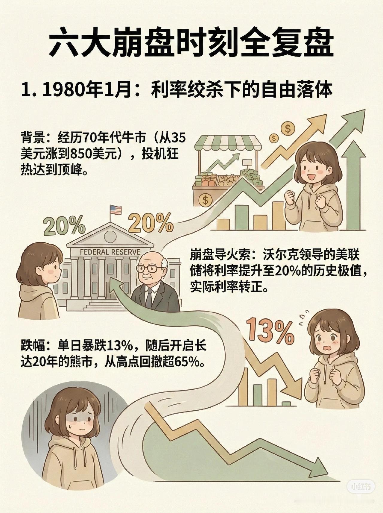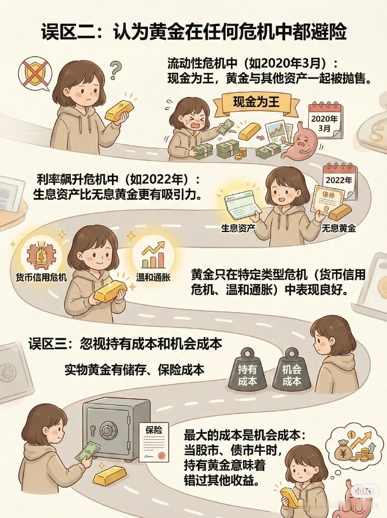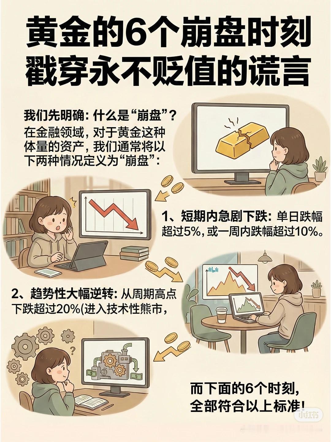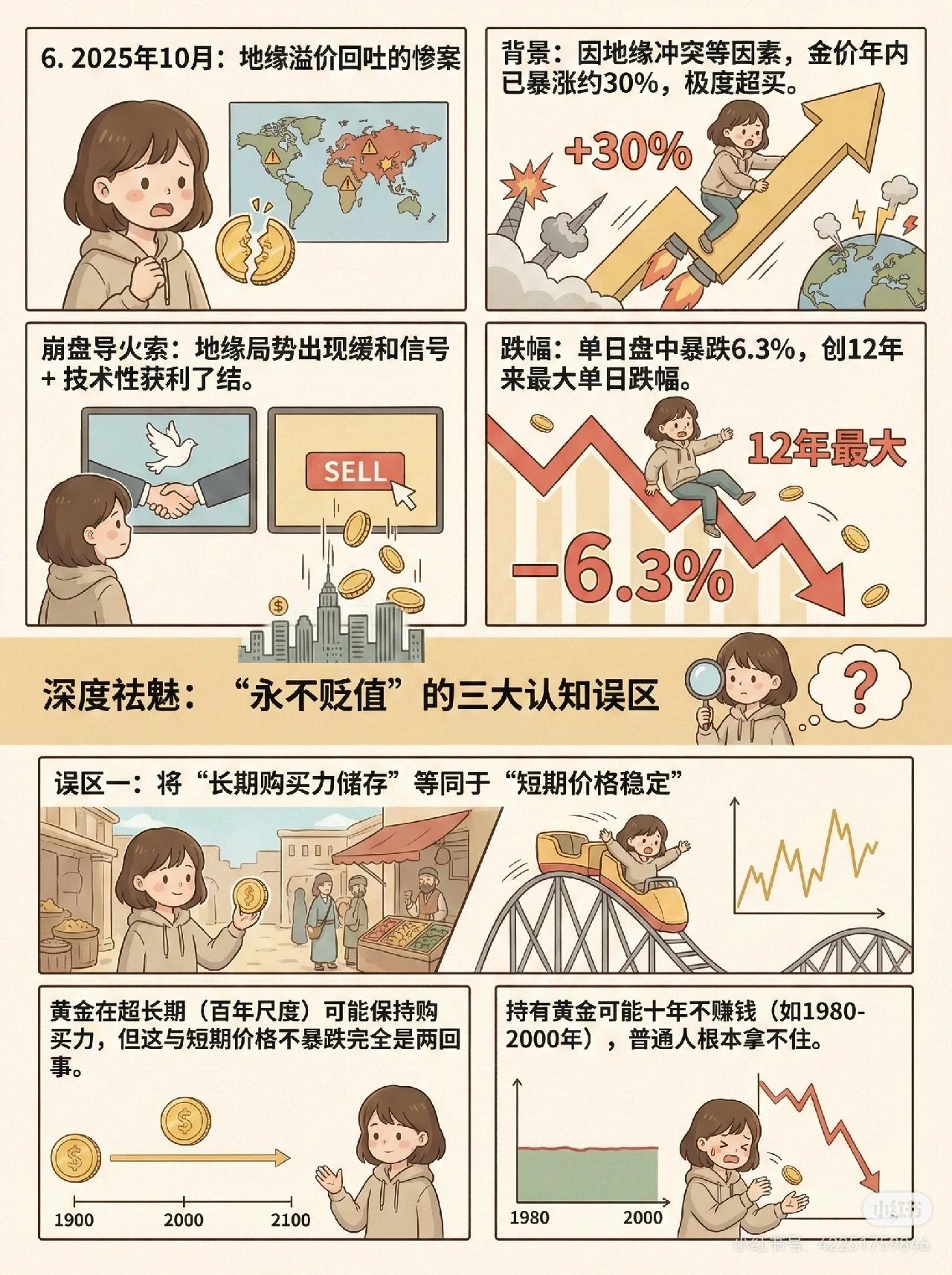 1️⃣ 崩盘的定义 - 短期内急剧下跌:单日跌幅 >5%,或一周内跌幅 >10%。 - 趋势性大幅逆转:从周期高点下跌 >20%,进入技术性熊市。 2️⃣ 黄金的 6 次崩盘时刻 1. 1980年1月:美联储利率升至 20%,实际利率转正 → 单日跌 13%,进入 20 年熊市,回撤超 65%。 2. 2013年4月:量化宽松预期落空 → 价格闪崩。 3. 2020年3月:疫情引发美元荒,机构抛售一切可变现资产 → 一周跌 14%,打破“危机中黄金必涨”认知。 4. 2022年:通胀高企+激进加息 → 实际利率转正并飙升,金价从高点跌超 20%,进入技术性熊市。 5. 2011年8-9月:创历史新高 1920 美元后情绪过热 → 出现“闪崩”。 6. 2025年10月:地缘溢价回吐 → 单日盘中暴跌 6.3%,创 12 年最大单日跌幅。 3️⃣ 三大认知误区 - 误区一:把“长期购买力储存”当成“短期价格稳定”(短期仍会暴跌)。 - 误区二:认为黄金在任何危机中都避险(流动性危机、利率飙升时可能不涨反跌)。 - 误区三:忽视持有成本和机会成本(储存保险费用 + 错失其他投资收益)。 📌 一句话总结: 黄金并非“永不贬值”,在高利率、流动性危机、地缘溢价回吐等情境下会大幅下跌,且其长期保值不等于短期稳定,投资时要警惕三大常见误区。