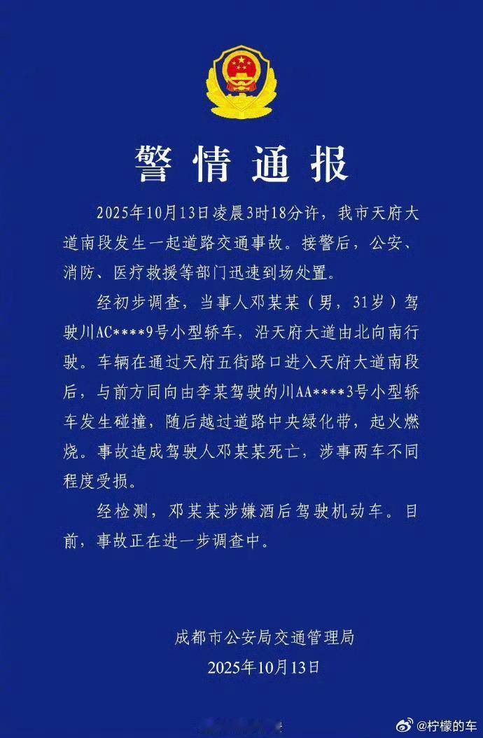 当时这件事发酵了有半个多月,社交平台上的传言和图到处都是,还有各种专家和kol参与这件事故的讨论,现在通报也已经下来了,驾驶者喝了酒,先撞了一辆车后冲进绿化带成都天府大道事故酒驾司机全责