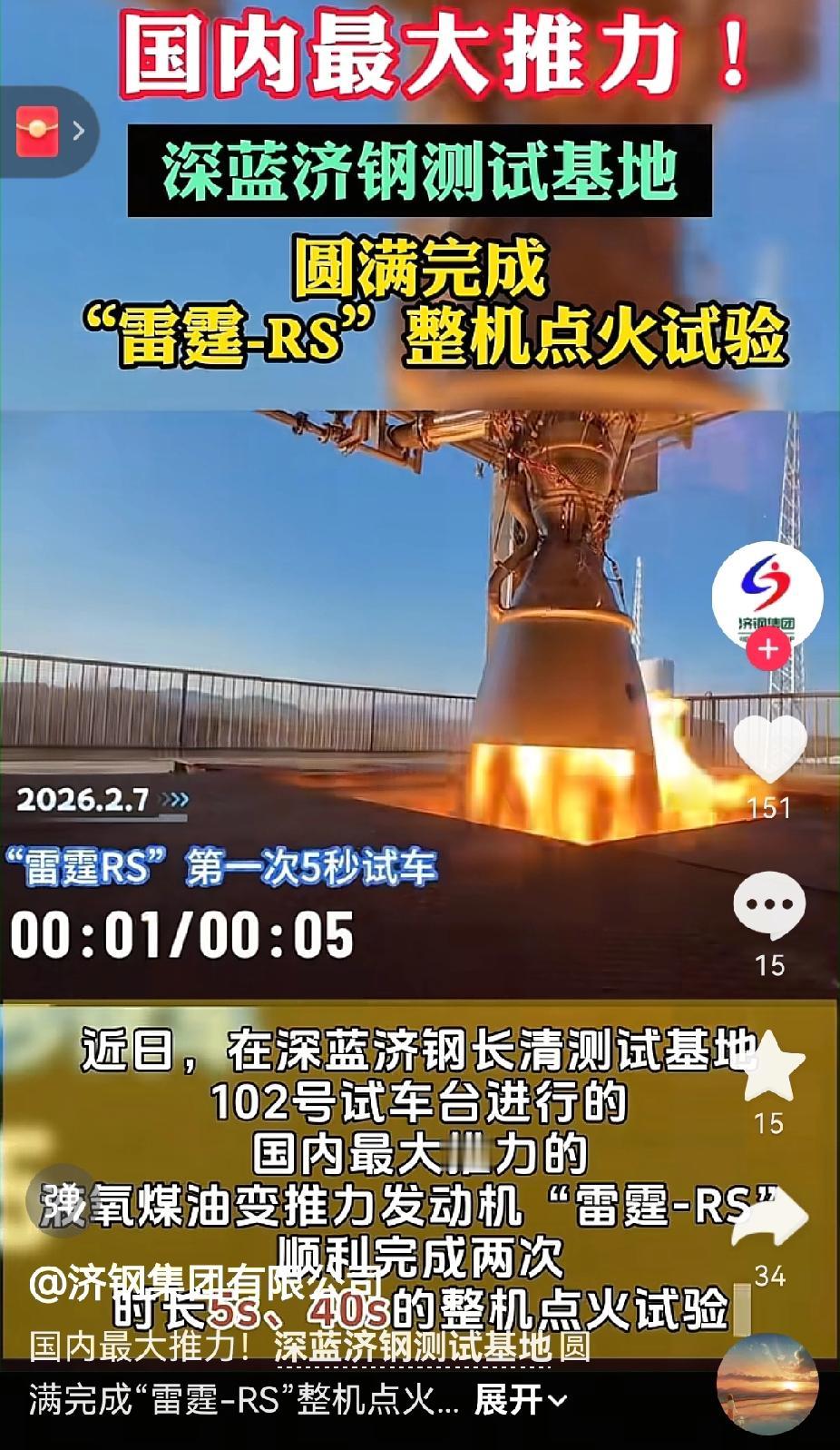 国内最大的液氧煤油火箭发动机在济南试车成功。 深蓝航天长清马山测试基地,“雷霆-RS”发动机整机点火实验成功。“雷霆-RS”是目前国内推力最大的液氧煤油发动机,单台推力为130吨。 目前我国推力最大的液氧煤油发动机是长征系列火箭的YT-100液氧煤油发动机,推力120吨。在研发的最大推力液氧煤油发动机是长征九号用的,推力为500吨。