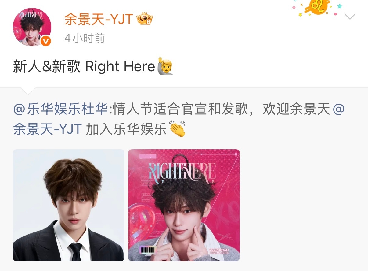 余景天官宣加入乐华欢迎加入乐华余景天✨ 入职即发新歌,双重惊喜太绝啦!未来在新家庭继续发光发热,期待更多惊艳舞台与优质作品,逐光而上,一路向前!