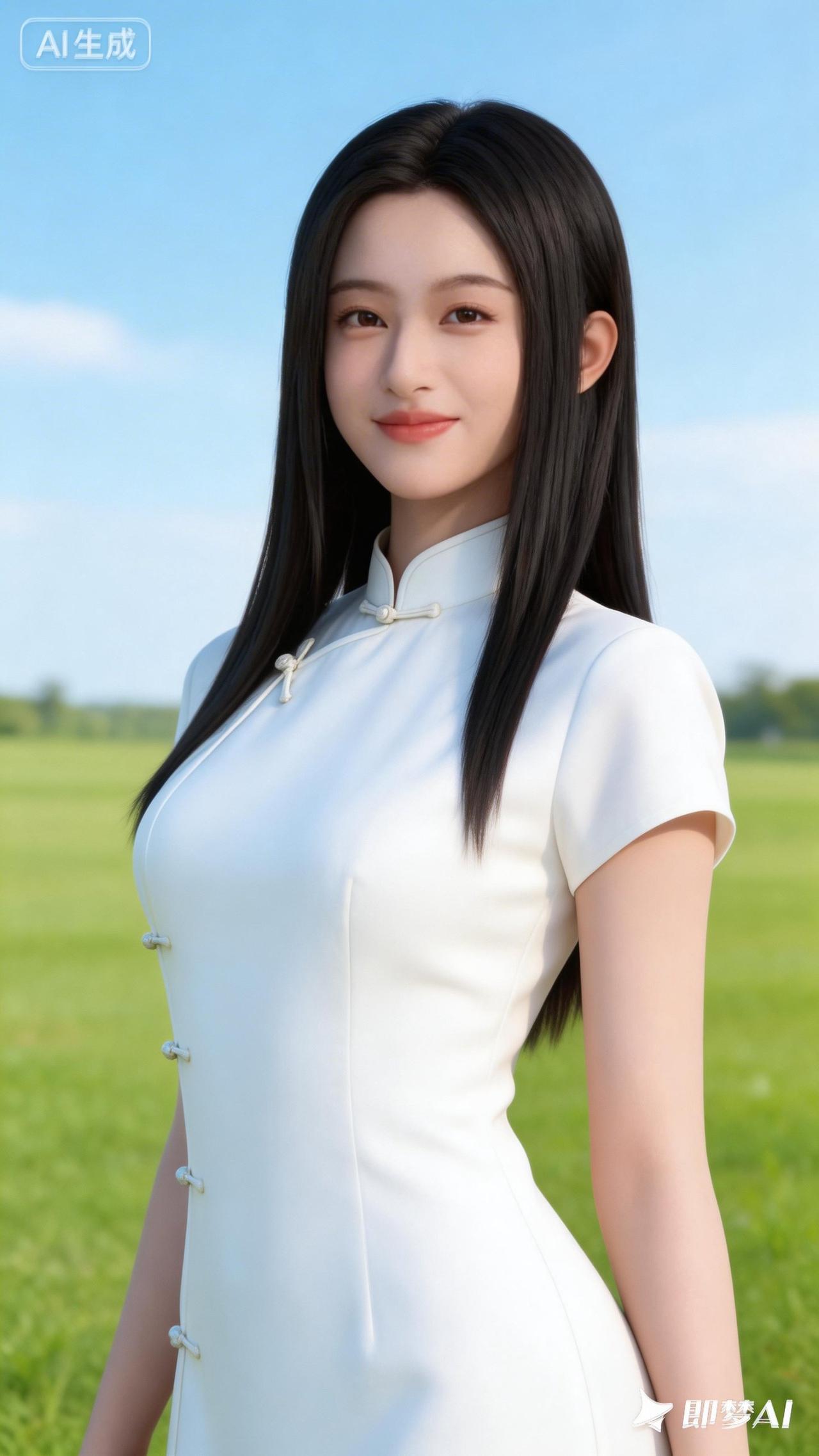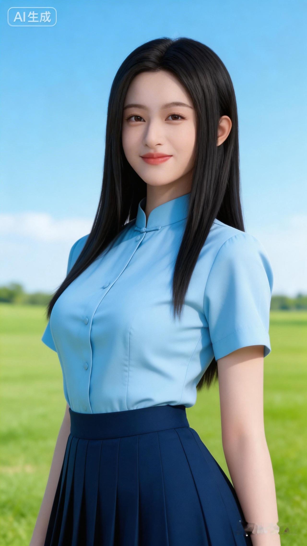 清新蓝裙少女,夏日草地上的优雅时光。