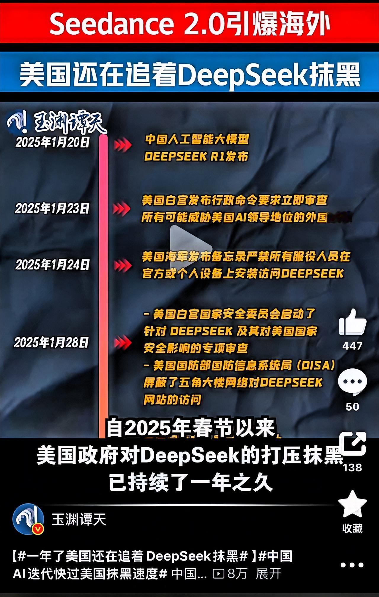 最近有个新闻挺逗的。咱们那个视频生成模型Seedance 2.0刚出来,大家都挺关注,结果大洋彼岸又出招了。OpenAI又跑去跟美国众议院告状,说咱们DeepSeek这不好那不对。我一看这消息就乐了,这都一年了,怎么还在揪着DeepSeek不放呢? 仔细想想这事挺有意思的。咱们这边都跑到2.0版本了,那边还在追着1.0的事情抹黑。这感觉就像什么呢,就像你已经换了个跑道在跑,后面的人还在你原来的位置瞎转悠,对着空气使劲。你跑得再快都听不见他骂什么了,他还以为自己骂得挺起劲。 美国对DeepSeek这么执着,说到底也不是冲着这一个东西来的。他就是看着咱们整个AI行业起来了,心里有点慌。但他那个打法吧,总让我想起一个成语叫刻舟求剑。他以为摁住了一个DeepSeek,就能把咱们整个行业摁住,哪知道咱们这边早就不是一两个点在往前走了。DeepSeek也好,Seedance也好,背后是一整个链条在动,人才、技术、产业,全都在往前拱。 所以你看,有时候真不用太在意那些声音。他们在那边吵吵什么版本的事,咱们这边版本早都更新了。真正做事的,哪有空跟人吵架。有那工夫,不如想想下一步往哪走。反正我是觉得,抹黑的人爱说什么说什么,创新的人该干什么干什么,跑着跑着,那些声音自然就听不见了。中国Al迭代快过美国抹黑速度