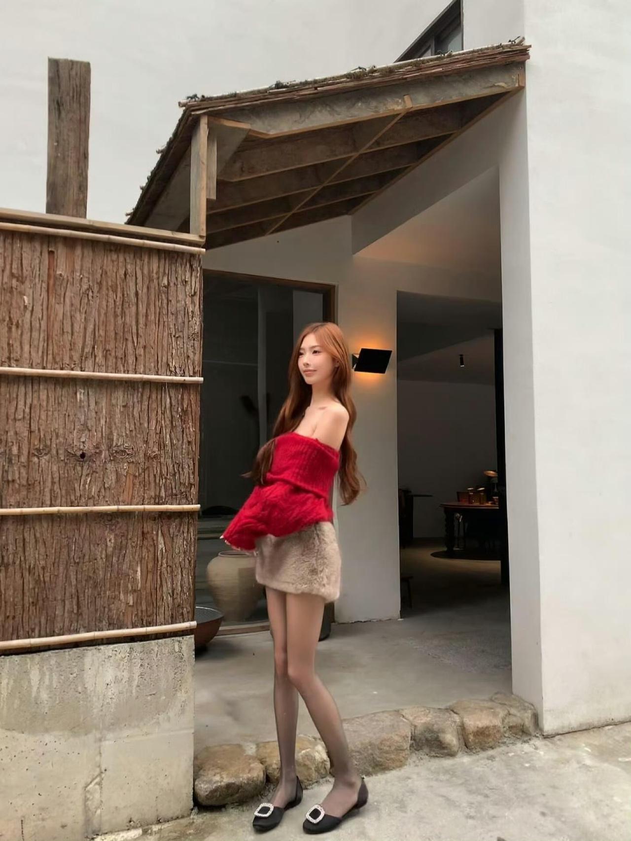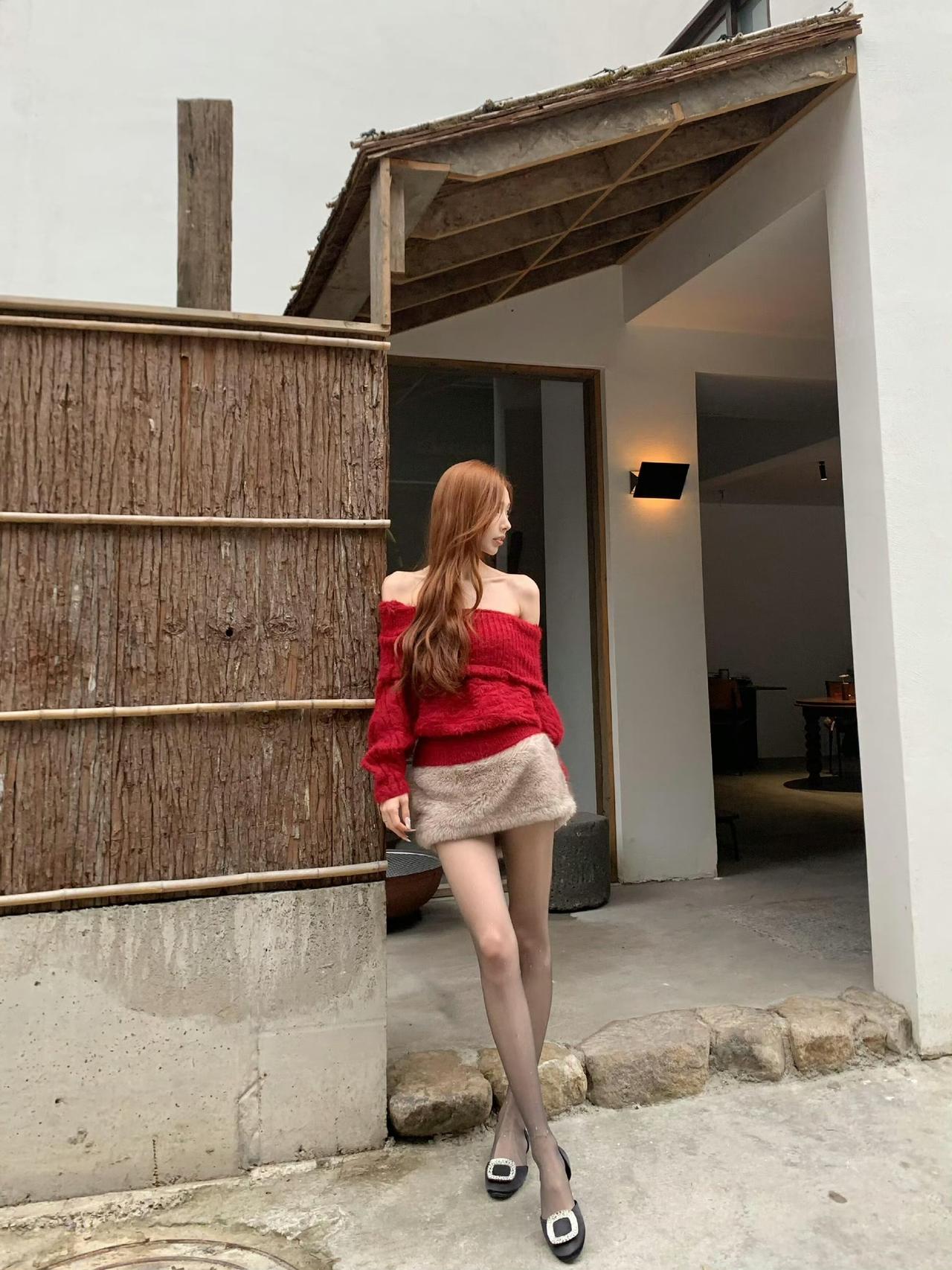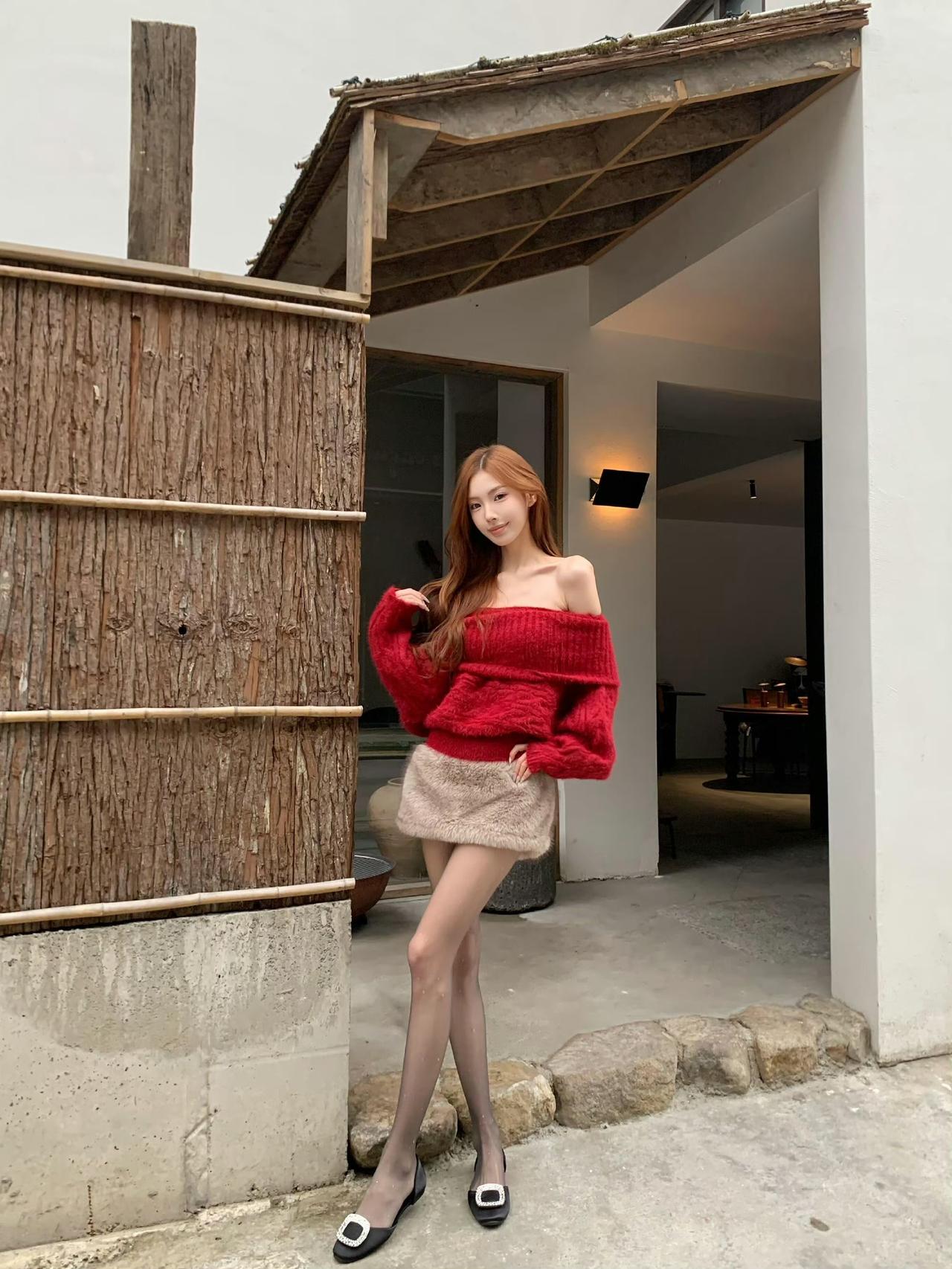 这套穿搭把“甜辣氛围”和“秋冬温暖感”结合得超妙!酒红一字肩毛衣自带明艳氛围感,毛绒短裙添了软乎乎的甜美元素,搭配带钻单鞋又显精致,在复古庭院里拍照特别出片。一字肩毛衣