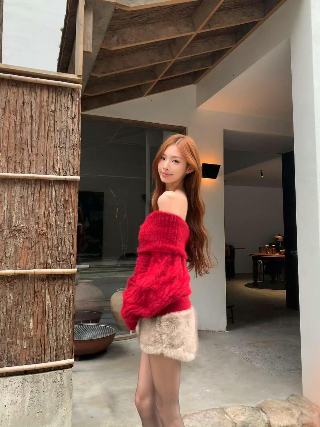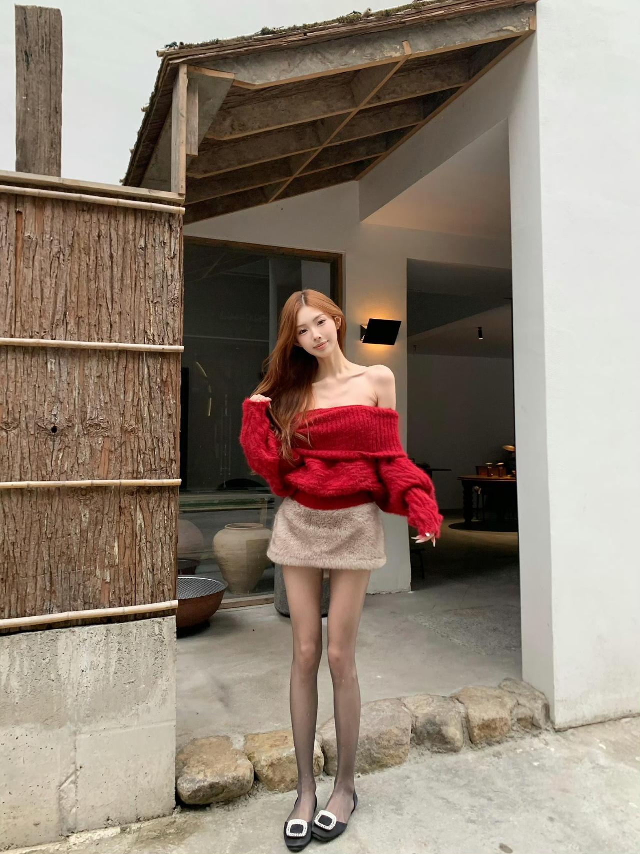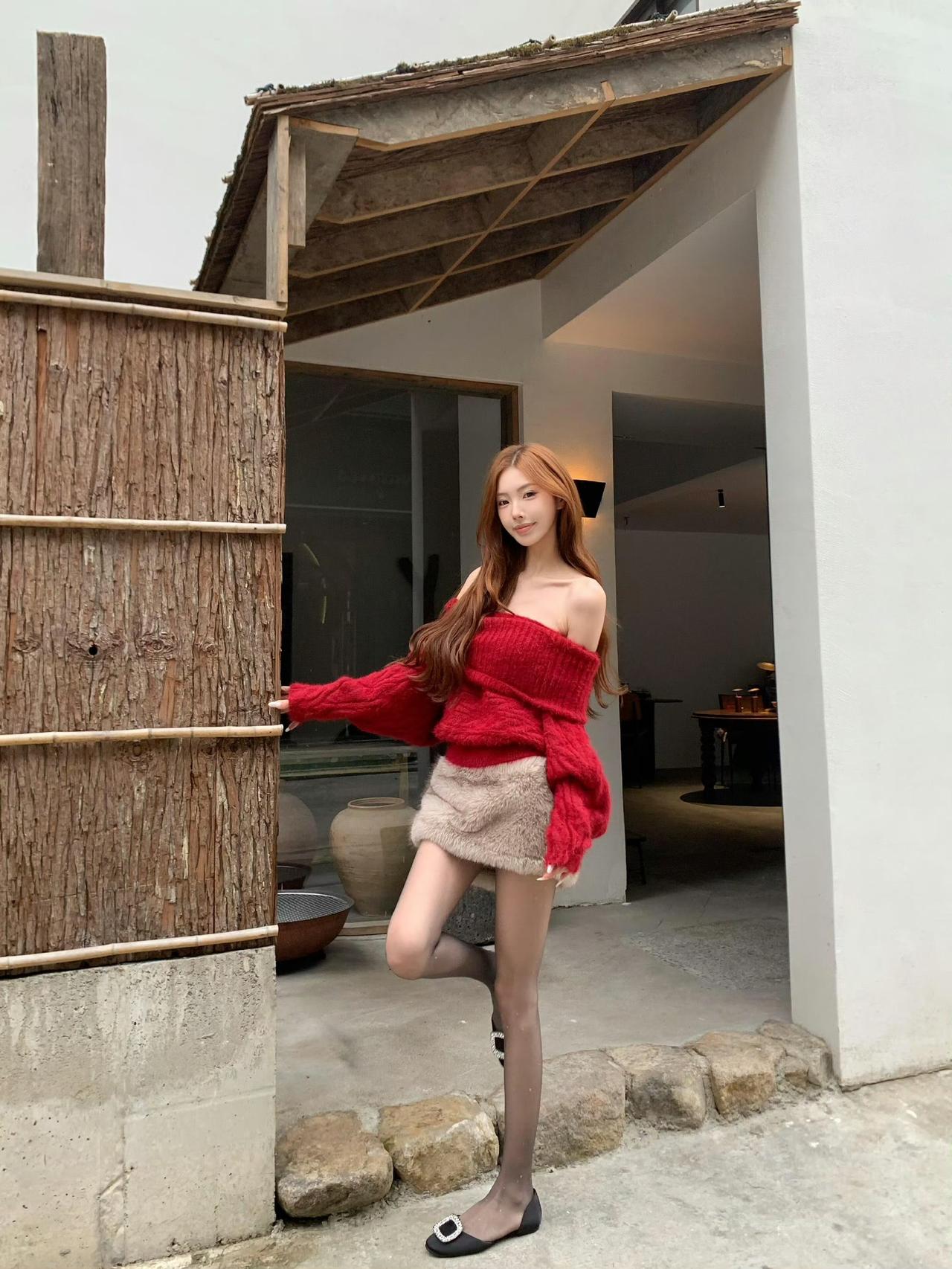 这套穿搭把“甜辣氛围”和“秋冬温暖感”结合得超妙!酒红一字肩毛衣自带明艳氛围感,毛绒短裙添了软乎乎的甜美元素,搭配带钻单鞋又显精致,在复古庭院里拍照特别出片。一字肩毛衣