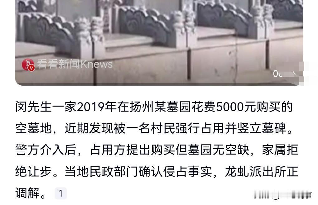 这真是太恶劣了,7年前买的空墓地被他人强占,管理员连阻止都阻止不了,真的是太不给力。 占用者强行下葬,还竖起了墓碑,也没有交钱,管理员阻拦未果。 这也太厉害了吧,不交钱,竟然强占别人的墓地下葬。 咋这么霸道呢? 警方已介入调解。 可问题是这块墓园已经没有其他的墓地了,7年前的买家肯定不愿意卖。