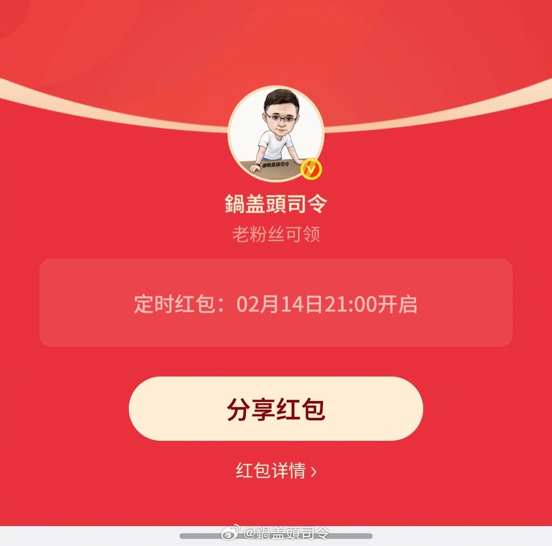 从昨天开始到初七,我每天发#红包#哈!年前每天1000个,年后每天3000铁粉包。关注我并铁了就行。今晚1000个已经定时好了,晚上21点!记得来!