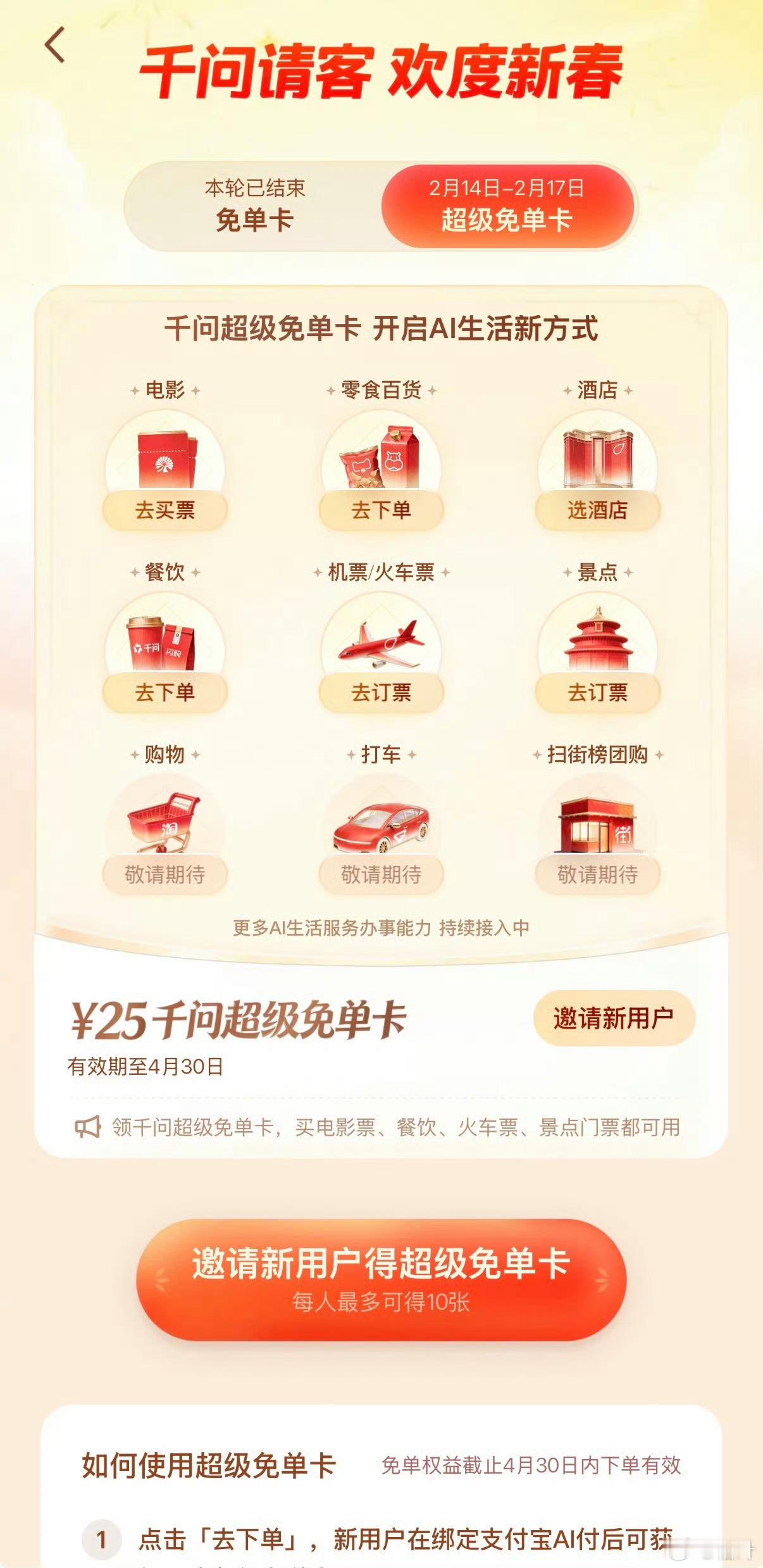 千问免单卡再加三天千问回应大免单再加3天千问很听劝啊,免单卡之前说能买盒马,现在电影票也安排上了。活动还多加3天,最多能领10张25元免单卡。酒店、机票、门票都能用,有效期还到4月底。越更新越实用,吃喝玩乐出行全包了。如果是用户直接领,邀朋友还能一起得。不错哦,没有套路是实实在在省钱。本来以为免单卡只是个小福利,没想到越做越良心,福利覆盖越来越全面,有效期又长。真心觉得好用,推荐给身边朋友了!