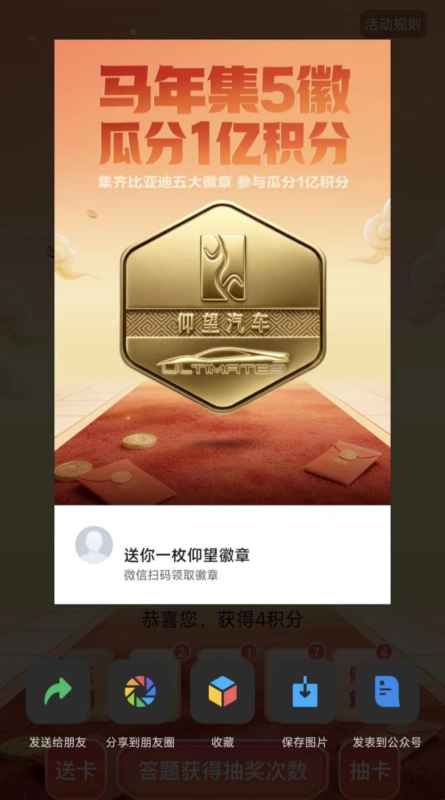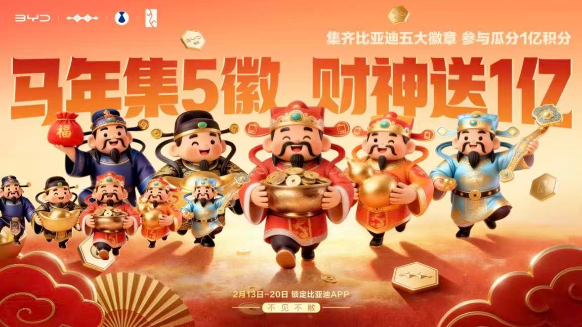 今年比亚迪整了一个回馈粉丝和车主的活动,很有意思,值得一看!2月13日-2月20日期间登录比亚迪APP,集齐王朝、海洋、方程豹、腾势、仰望五大品牌的徽章,合成“比亚迪集团大徽章”,就可以瓜分1亿积分,而且本品车主首次登录就可以获得本品牌徽章。最关键的是积分可以购买车辆保养、延保、自营百万好物,实打实的有用。同时不管是不是比亚迪车主,都可以参加活动,马年集徽享好礼,赶紧去试试吧!