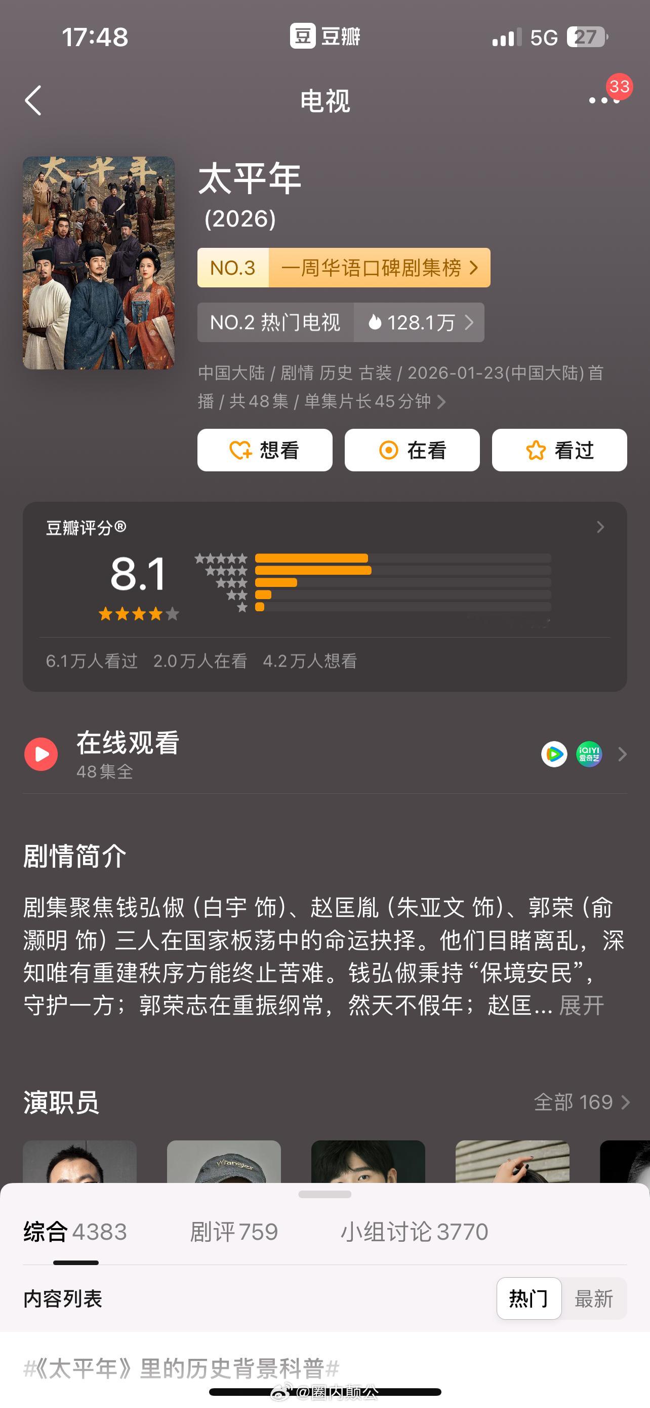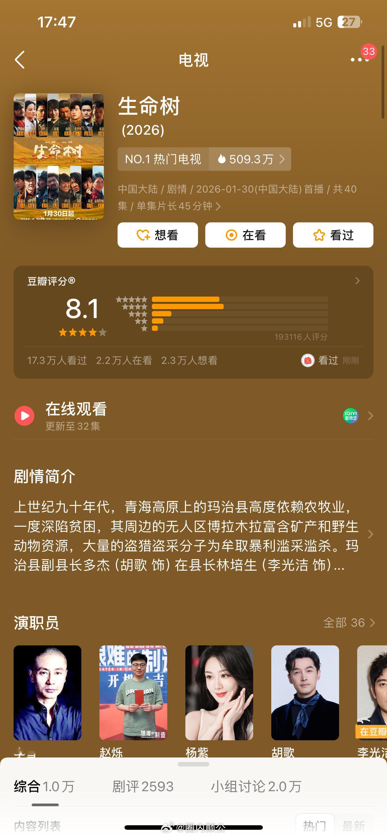 杨紫胡歌电视剧《生命树》豆瓣开分8.1,目前跟白宇周雨彤《太平年》同分 大家觉得高了还是低了