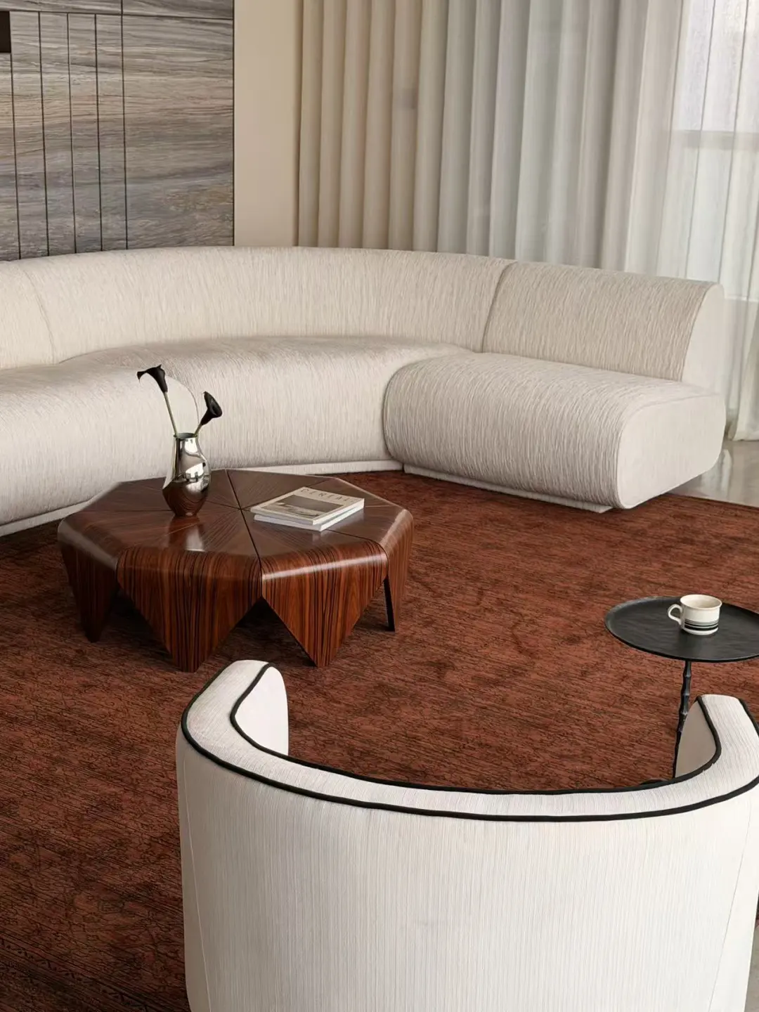 客厅没有多余装饰,极简又艺术的弧形沙发、几何感满满的实木茶几,