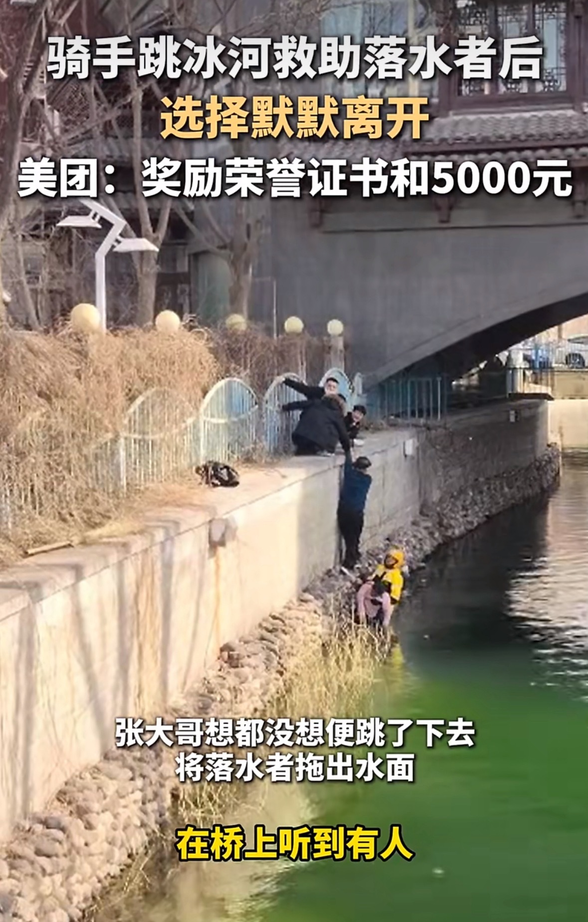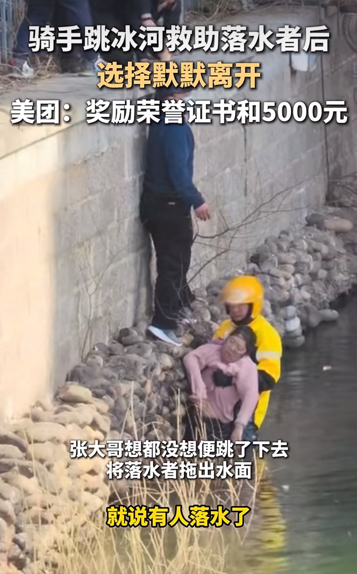 跳冰河救人骑手获见义勇为奖金来个暖心故事,寒冬腊月外卖小哥见义勇为跳冰河救人,几乎没有任何其他的思考,出自本能的救人让人钦佩。