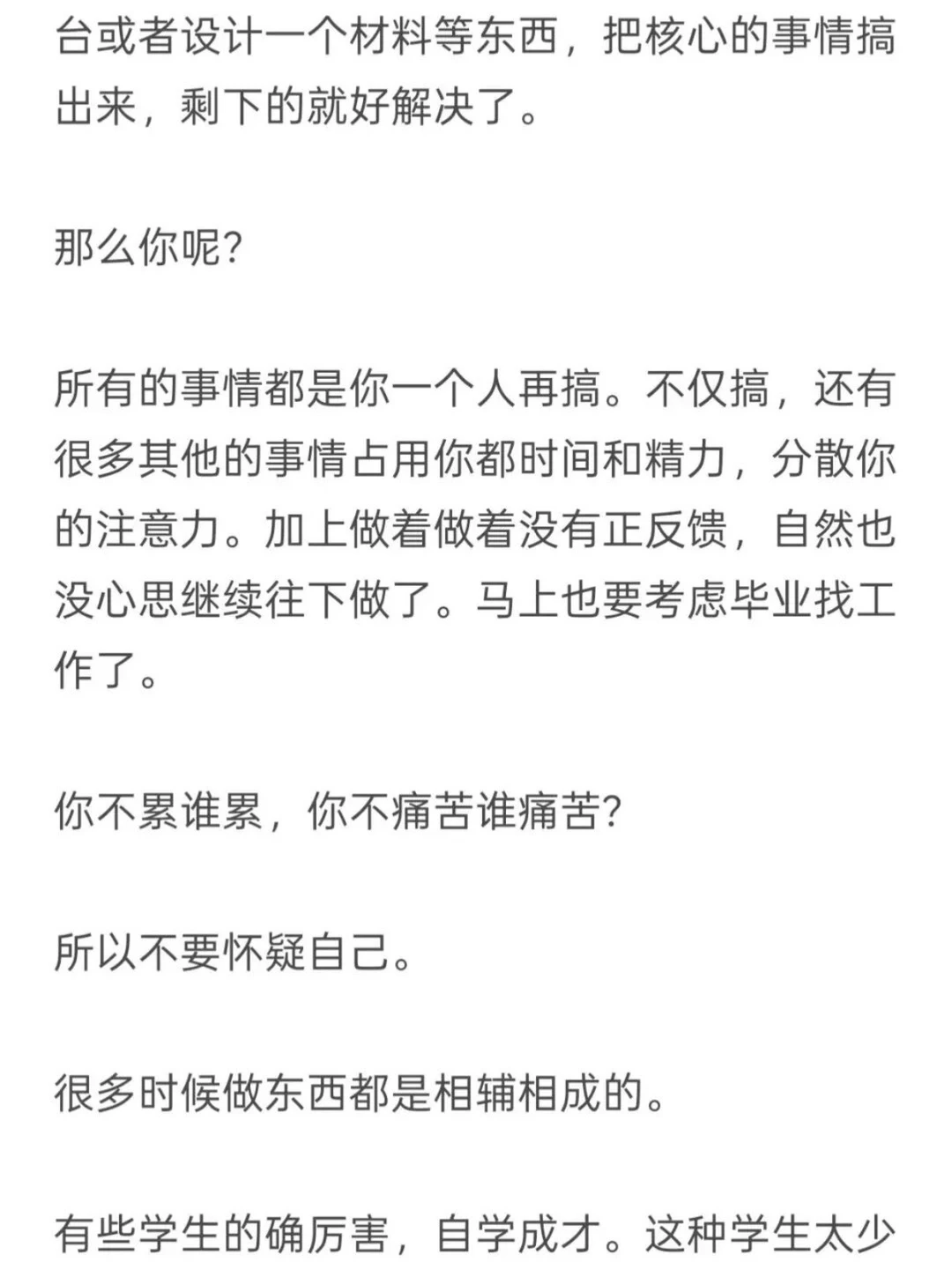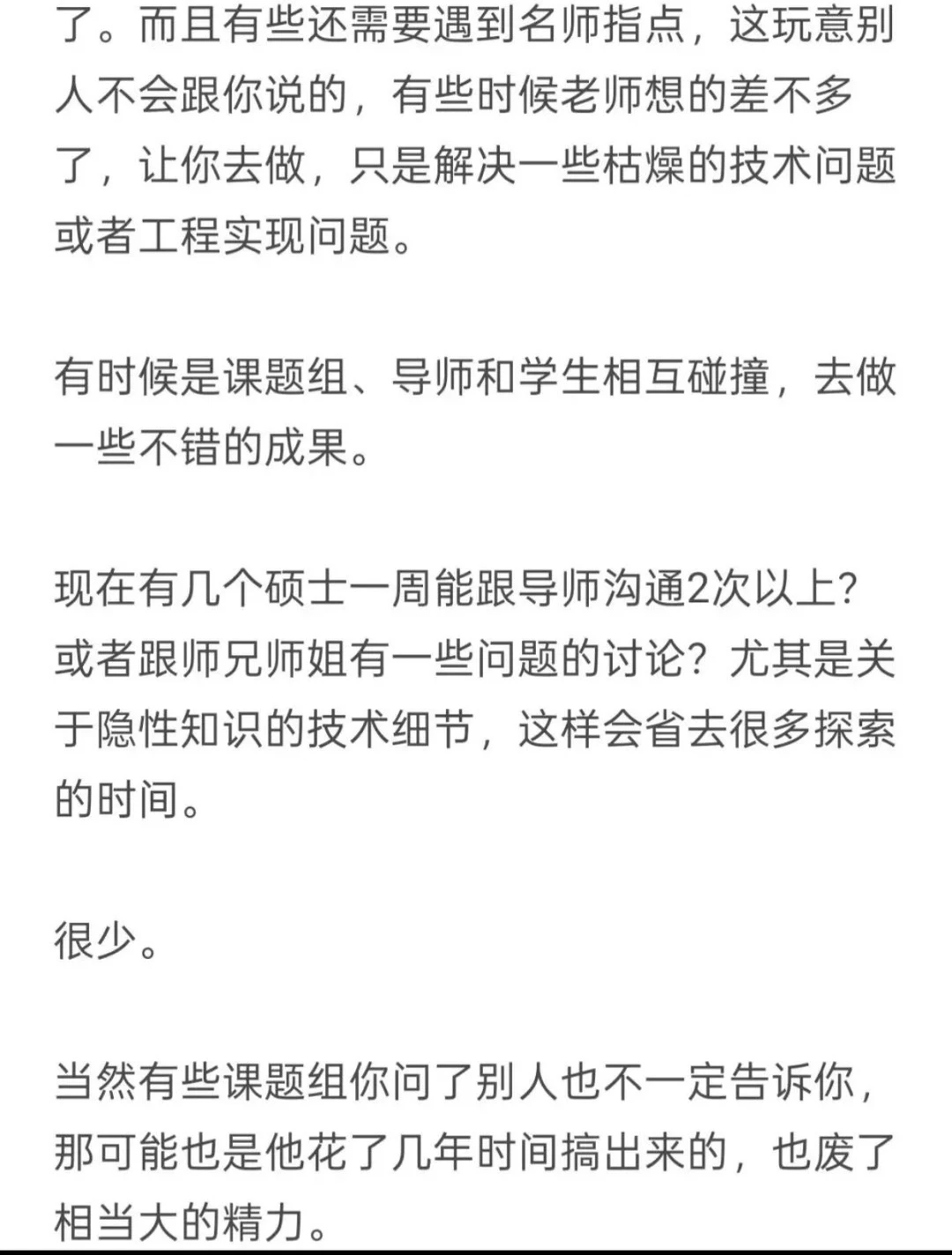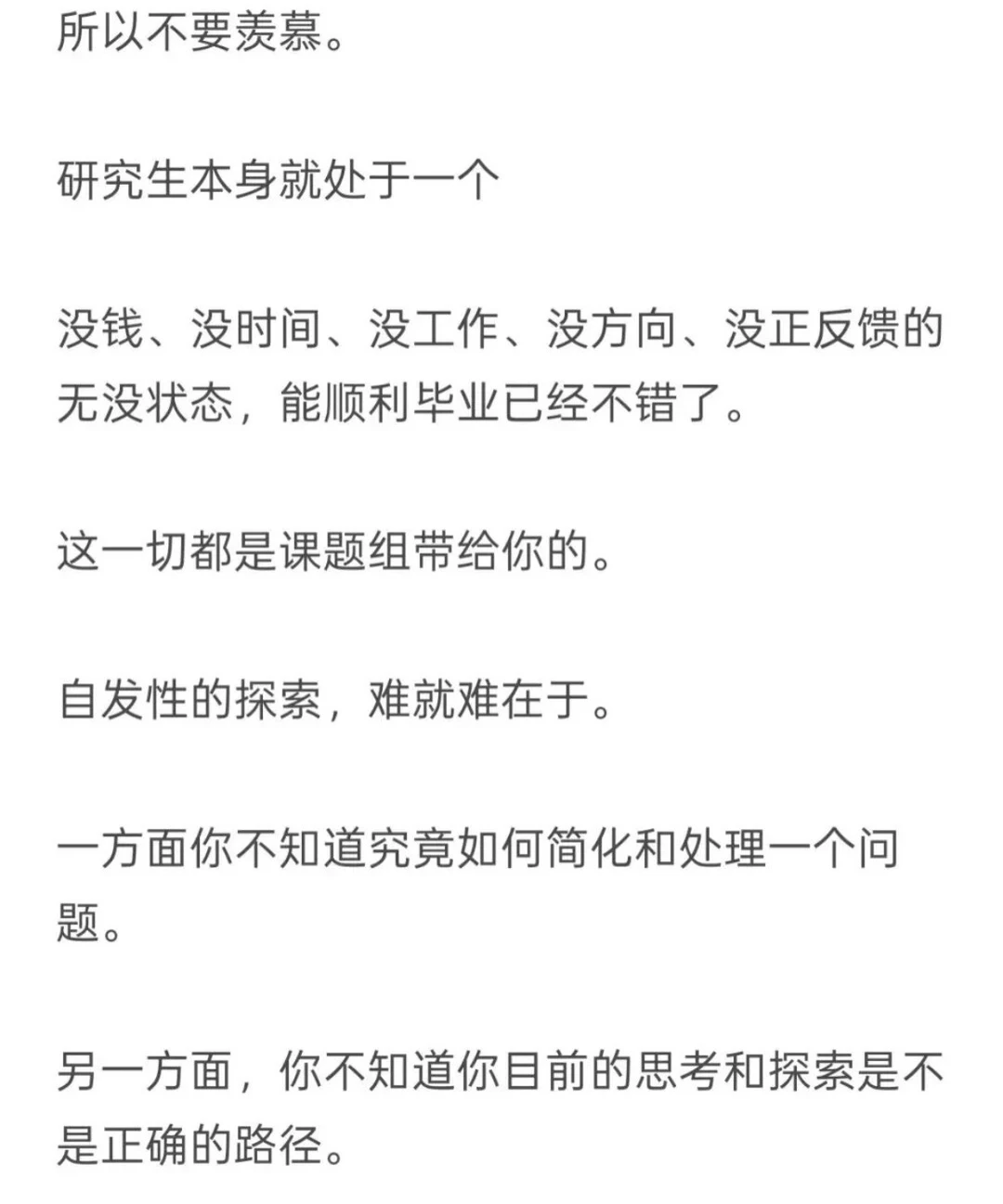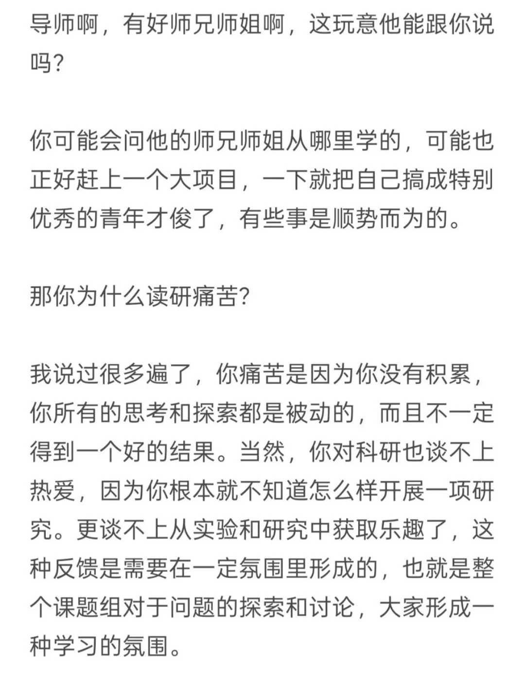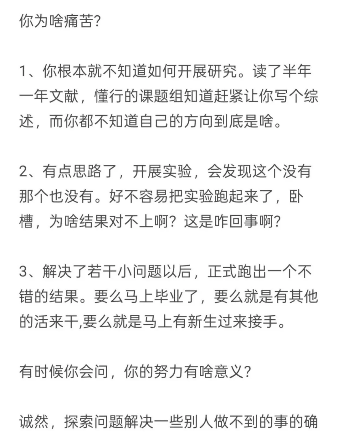 读研很痛苦正常吗? 下雪 开心)(家庭) 读研感觉到痛苦就对了,说明你已经能开始认识社会化,意识到进入一个新环境,没有人care你,没有人帮助你,没有人指导你,有些事情如果没有平台、资源和早期积累的助力,你去做一些事情到底有多难。 没有什么事情是理所当然的。 如果你幸运的遇到一个好导师,进入了一个好课题组,比较顺利的在导师的指导下开展了你的研究,课题组不愁经费,项目很多,大家都有规定做的方向,师兄弟姐妹都比较友善、互帮互助,课题组充满了学术讨论氛围,并且大研究生读研