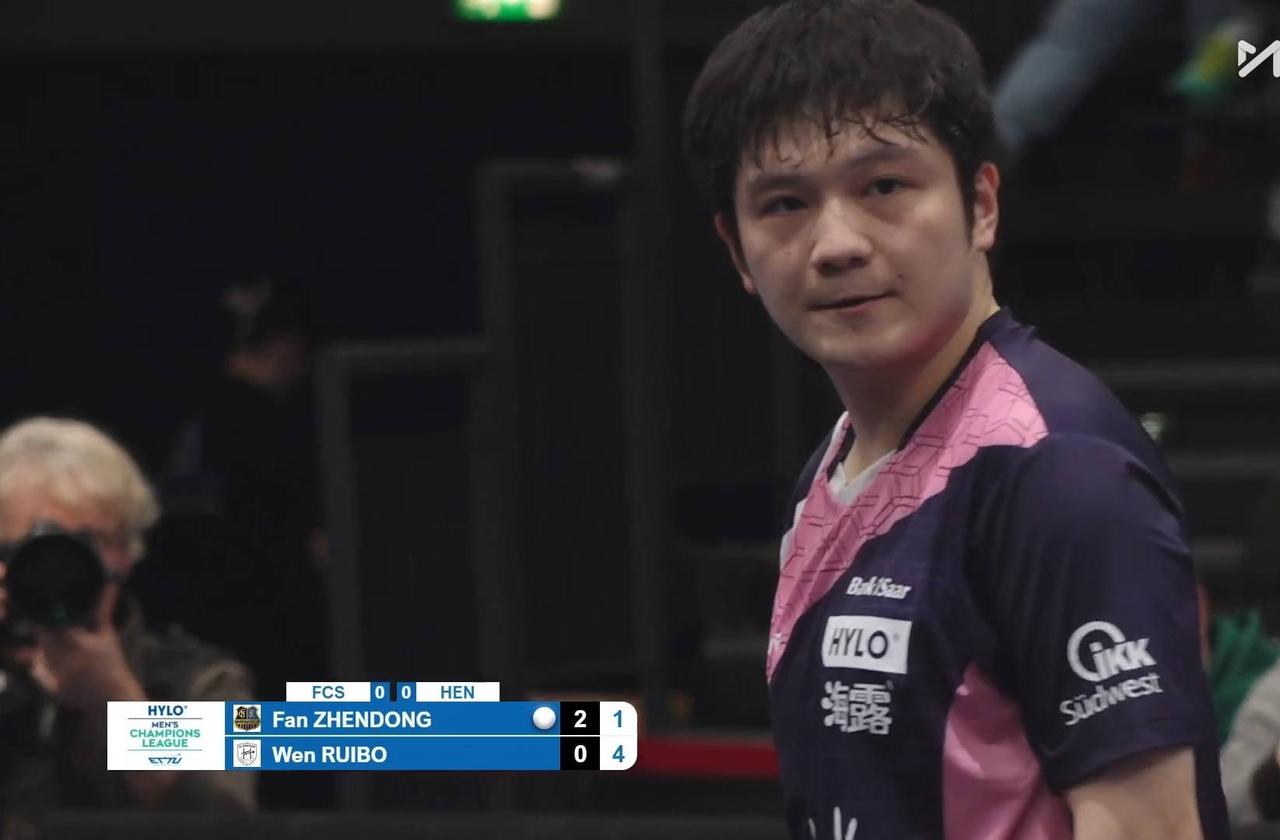 在欧冠的1/4决赛现场上演的一场中国德比,萨尔布吕肯主场迎战亨尼邦,樊振东首次在比赛中与温瑞博交手。 一位是T0级大师,一位是国乒新秀,两人交手赚足了眼球,樊振东在2:0的大好形势下,第三局状态下降,被温瑞博扳回一局,第四局樊振东在9:4大比分领先的情况下,痛失好局,10:12惜败,决胜局抢6,1:6失利,最终与温瑞博的首次交手2:3惜败。 樊振东近几场球打得都有一个共同点,状态很佳的情况下,某一局会突然掉链子,前面几场是赢回来了,常在河边走,哪有不湿鞋,今天遇到年轻有实力的温瑞博,倒成了纵虎归山,但相信樊振东能很快调整,恭喜温瑞博。