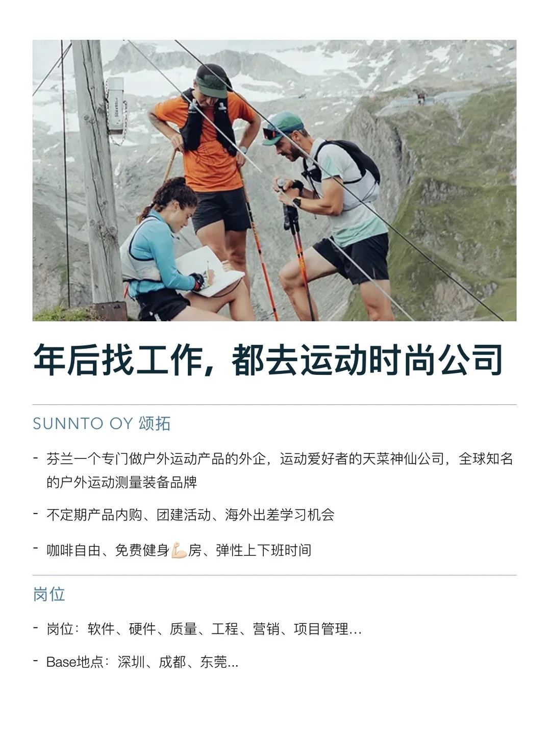 这几年运动 + 时尚真的越来越火了。很多运动品牌都很火(比如始祖鸟、lululemon这些...),已经不只是卖衣服,而是在卖一种生活方式 看了下岗位也不只是门店销售,像品牌内容、社媒、电商、市场策划、视觉设计这些需求一直都不少 日常接触的就是穿搭、运动、生活方式内容,本身就挺有意思,很适合对审美和表达有要求的人。福利也都不错,基本 955、双休、年假 10–15 天,还都有很香的内购 坚持日更✊🏻,对外企感兴趣的欢迎常来看看