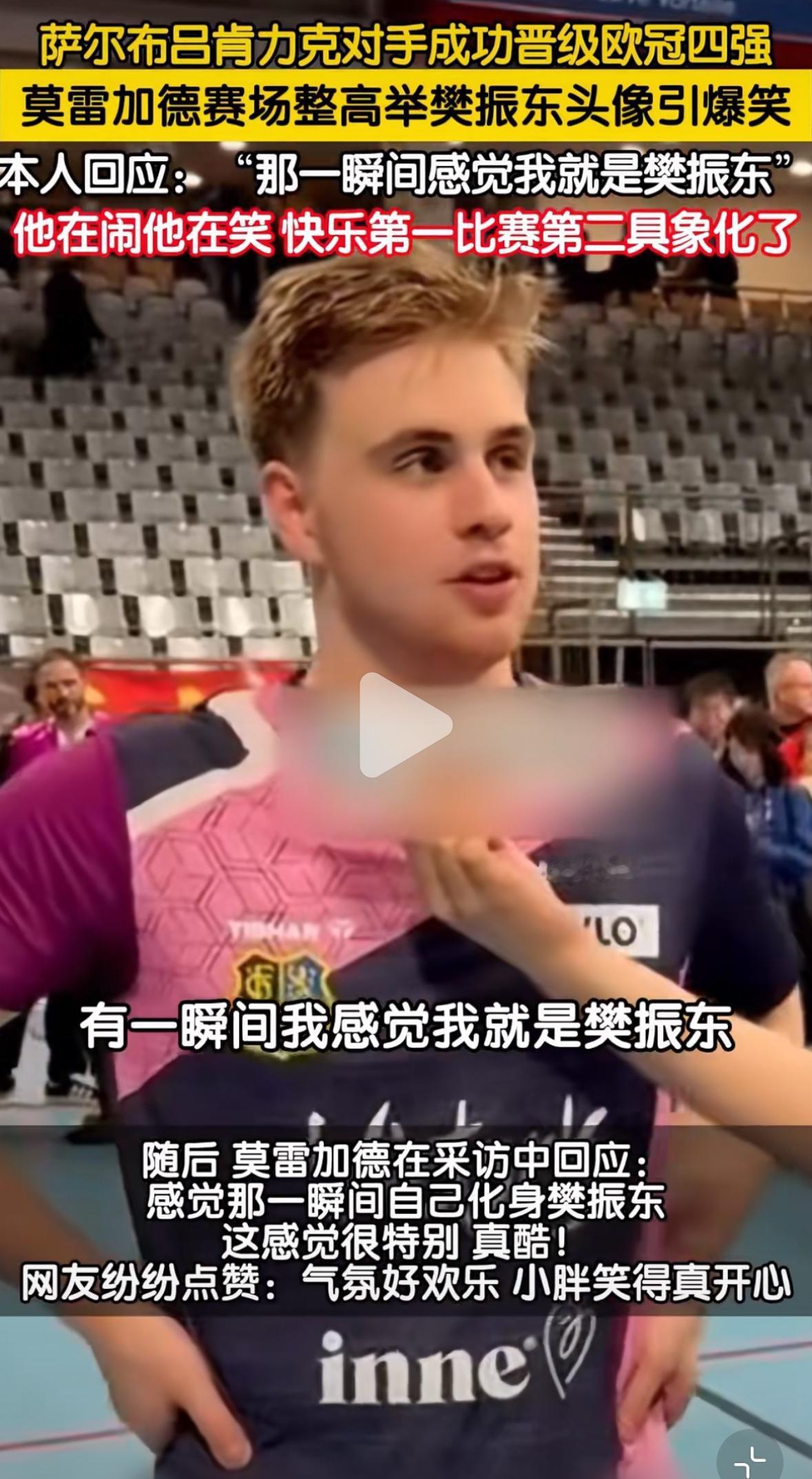 莫雷加德憧憬欧冠目标是冠军:有樊振东在,就让人感觉很有底气! 萨尔布吕肯晋级欧冠四强后, 莫雷加德在采访中表示, 现场观众非常懂乒乓球, 知道什么时候欢呼, 什么时候给球员鼓劲! 比赛结束,我拿着樊振东的头像, 感觉那一瞬间, 我就是化身了樊振东, 那种感觉真的很酷! 感觉非常珍惜欧冠赛场上的每一秒! 晋级欧冠四强, 我的目标就是冠军, 而且队伍中有樊振东, 非常有底气, 我要与樊振东一起获得胜利! 有他在队伍里, 我们都非常有信心! 莫雷加德真的好会说话, 也非常佩服樊振东, 他说巴黎奥运会樊振东的 “熊猫趴桌” 那个球,就是他觉得樊振东好久 没有笑了,他就想打一个让 东哥开心的球! 而且最终,在高压下 樊振东真的笑啦……