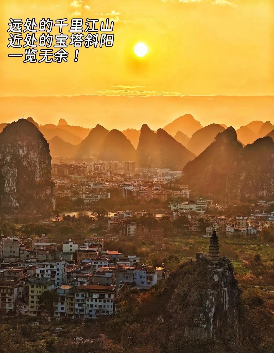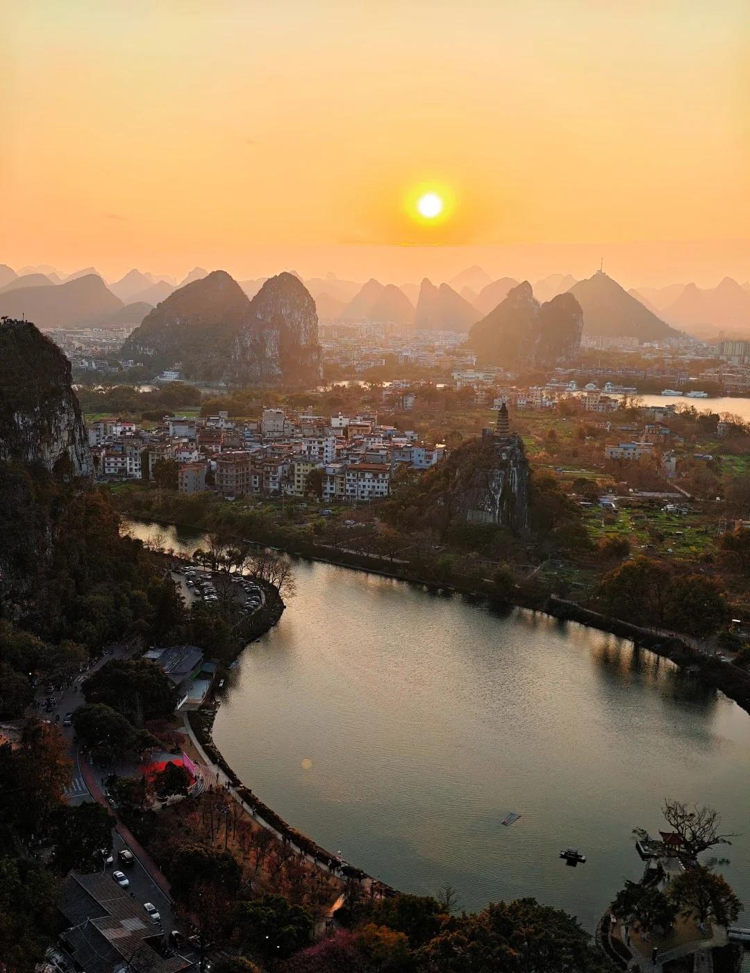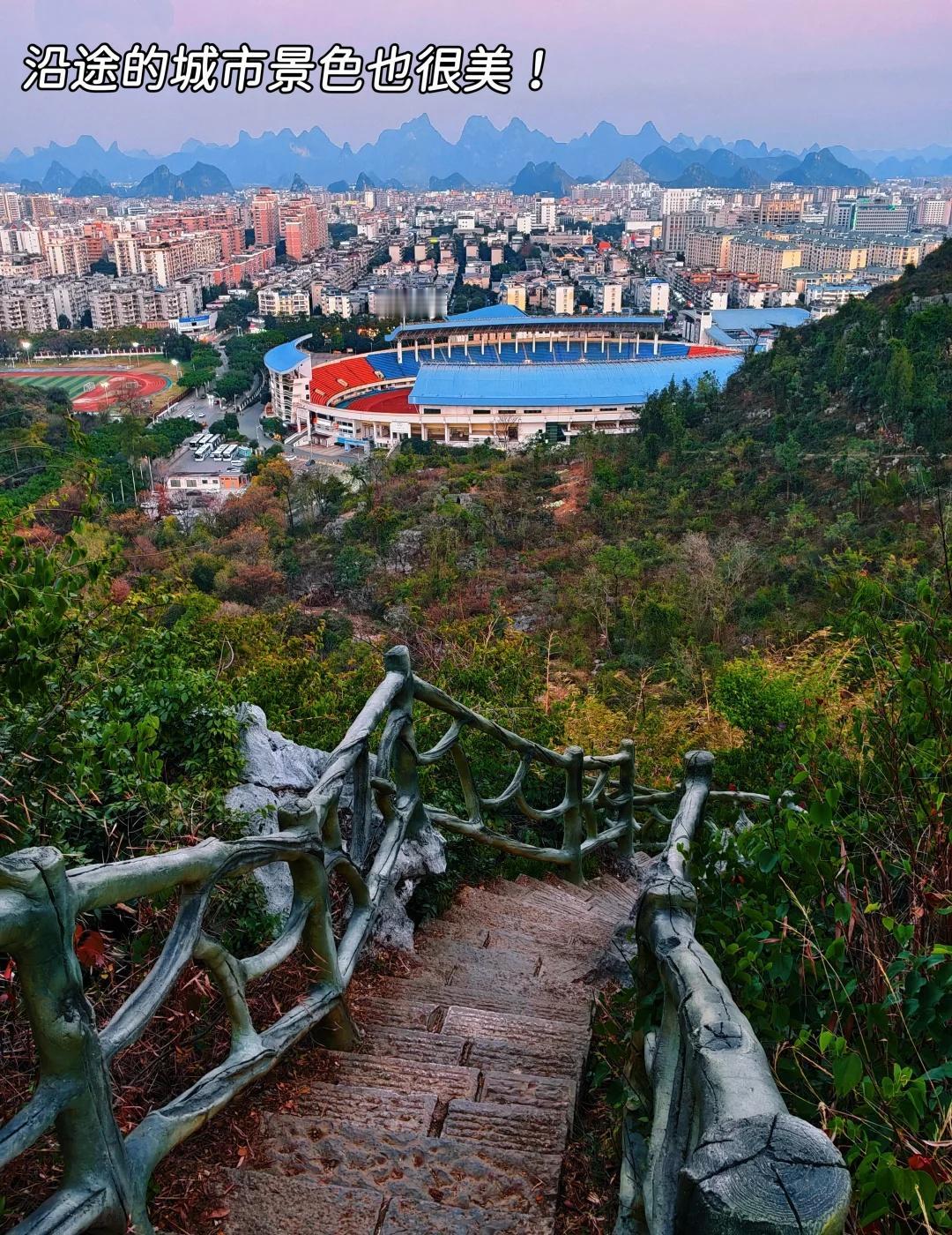 桂林旅游记住这个口✅千里江山!日落绝美! “千里江山图”何必去阳朔人挤人?! 桂林市区就有! 全程300米,徒步15分钟登顶 俯瞰整个桂林! - 📍【怎么去?】(图3-图4) 导航“穿山公园北门”→ 见到“穿山公园”牌坊再往前约100米→ 地上有个斜着的斑马线→ 左侧就是登山入口! 登山途中有2个岔路口(图5、图6),跟着图示走就到顶上的“穿北亭”! - ⚠️tips: 1.下午四五点去,到山顶刚好等到夕阳!日落后别着急走,晚霞染遍天空更美! 2.冬天山顶有点冷!风大!穿厚点! 3.汽车不好停车!电动车可停到“穿山岩”外(图7),再走十来米到爬山口 - 建议收藏备用!冲!😝 -