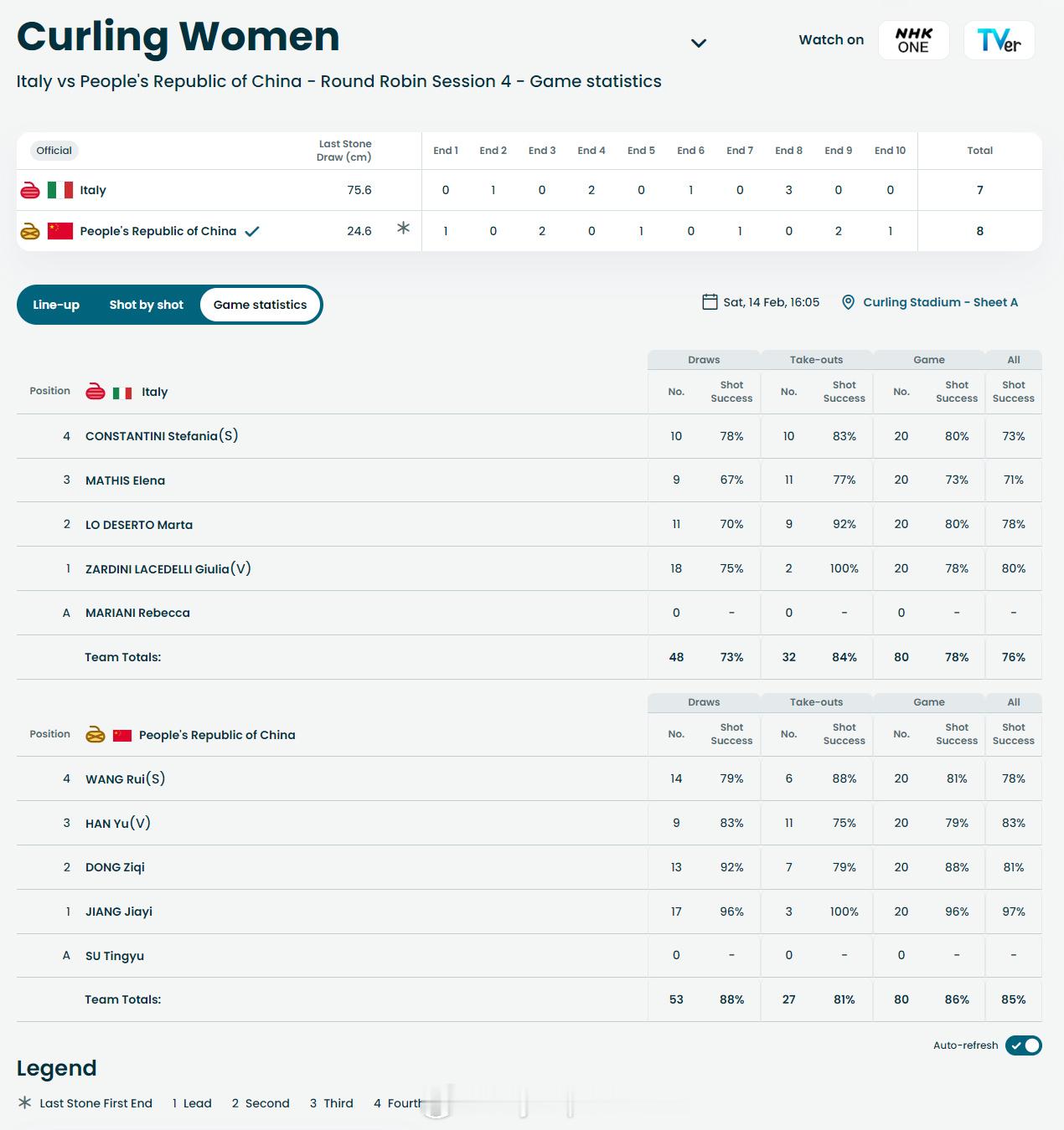 【冬奥女子冰壶中国绝处逢生 8-7绝杀意大利】冬奥会中国冰壶女队vs意大利2月14日,冬奥会女子冰壶循环赛,中国队面对东道主意大利,在第八局被对手拿到3分、最后一局先手的不利形势下,偷分成功以8-7绝杀对手,取得第二胜。北京时间15日21:05,中国队将迎战美国。 中国冰壶女队8比7意大利