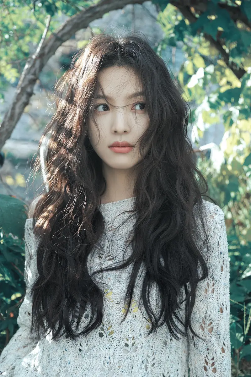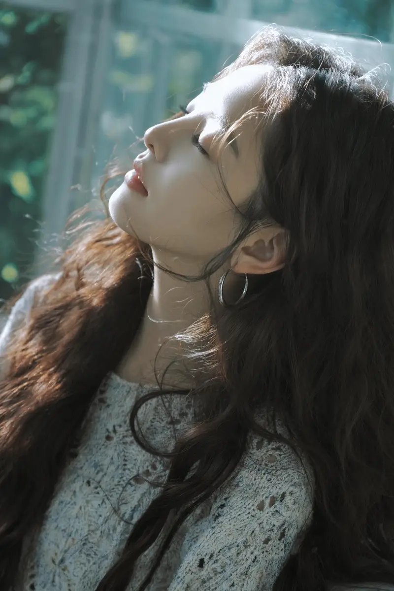章若楠穿镂空针织衫配银圈耳饰清透温柔 发丝轻扬自带轻盈呼吸感