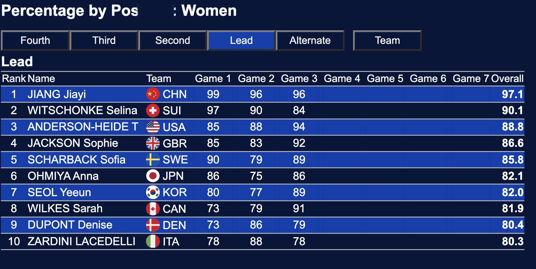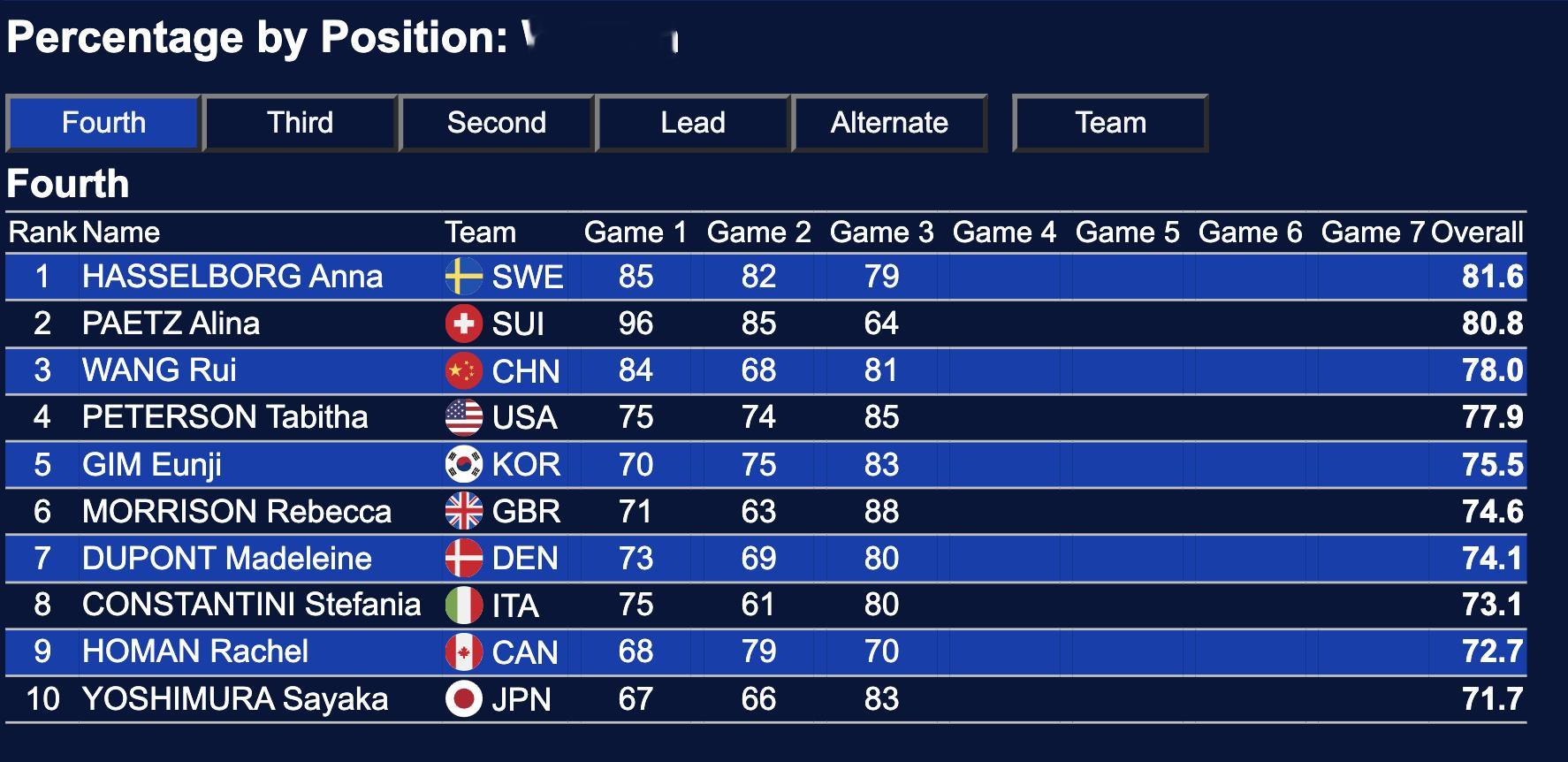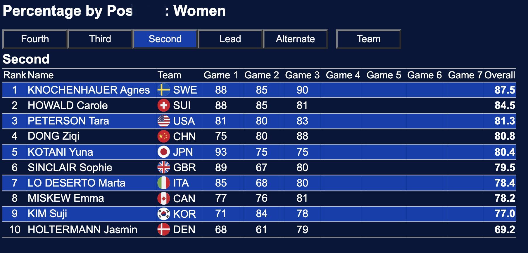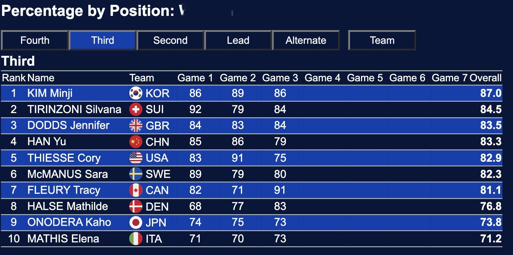 三轮过后,中国冰壶女队总体成功率排名:第2(仅落后第一名瑞士0.2%)