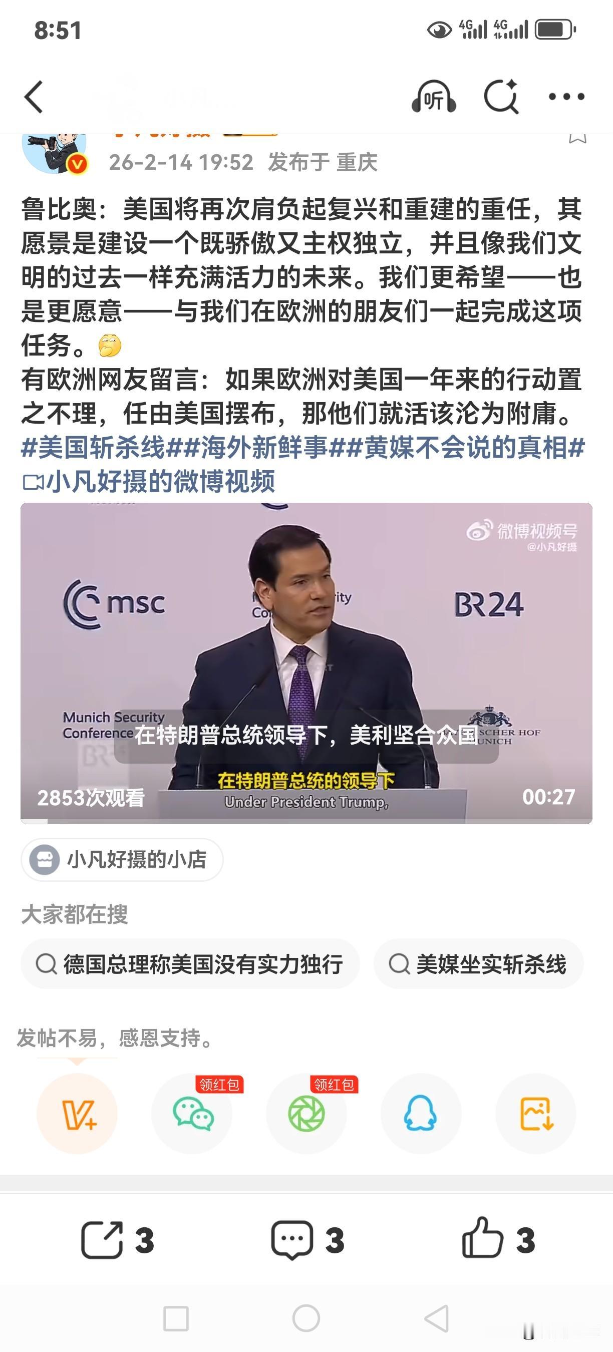 美利坚这是又上那根弦了,鲁比奥:美国将再次肩负起复兴和重建的重任,其愿景是建设一个既骄傲又主权独立,并且像我们文明的过去一样充满活力的未来。我们更希望——也是更愿意——与我们在欧洲的朋友们一起完成这项任务。[偷笑] 有欧洲网友留言:如果欧洲对美国一年来的行动置之不理,任由美国摆布,那他们就活该沦为附庸。