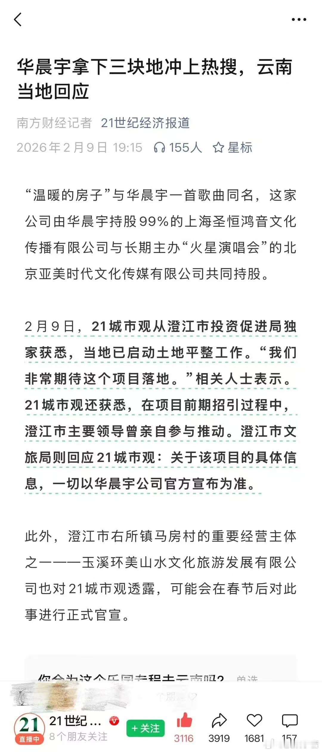 华晨宇拿下三块地文旅推动支持 实锤来了!为了给歌迷更好的体验,直接把火星演唱会2.0升级为永久自建模式!澄江投资促进局官方证实:土地已平整,主要领导亲自推动招引,表示“非常期待项目落地”!以后火星人不用再追着跑了,抚仙湖畔有家了,2026春暖花开,一起回家!